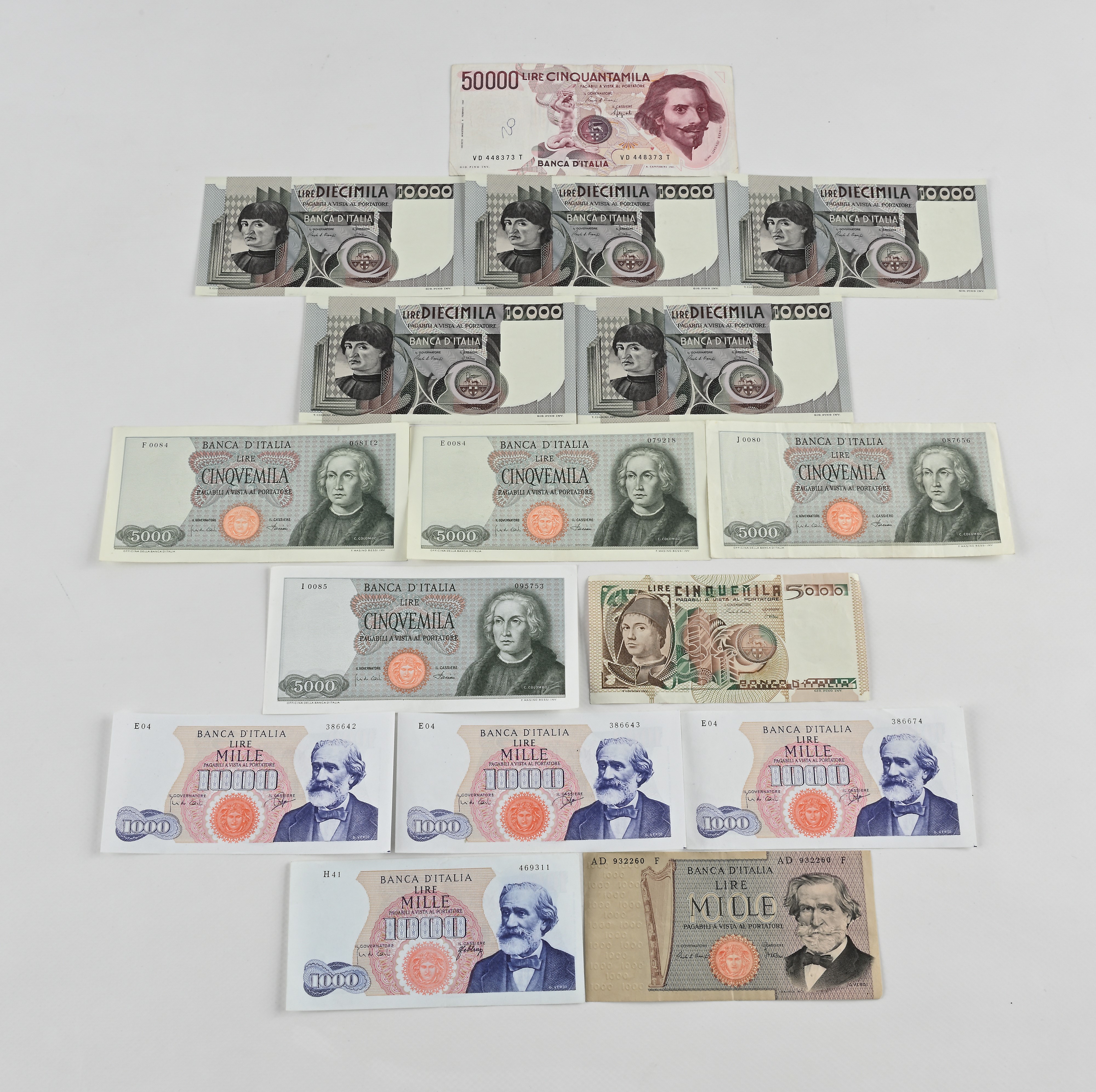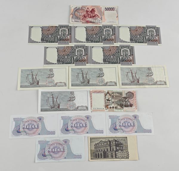 Lotto cartamoneta italiana: 1.000 Lire Verdi Decreto 14 luglio e 28 giugno 1962 Carli (3); 20 maggio 1966 e 28 giugno 1962 Carli; 5.000 Lire Colombo Decreto 4 gennaio e 20 agosto 1968 Carli (4); 10.000 Lire 6 settembre 1980 e 25 agosto 1976 Ciampi (5); 1.000 Lire Verdi; 5.000 Lire Antonello da Messina e 50.000 Lire Bernini