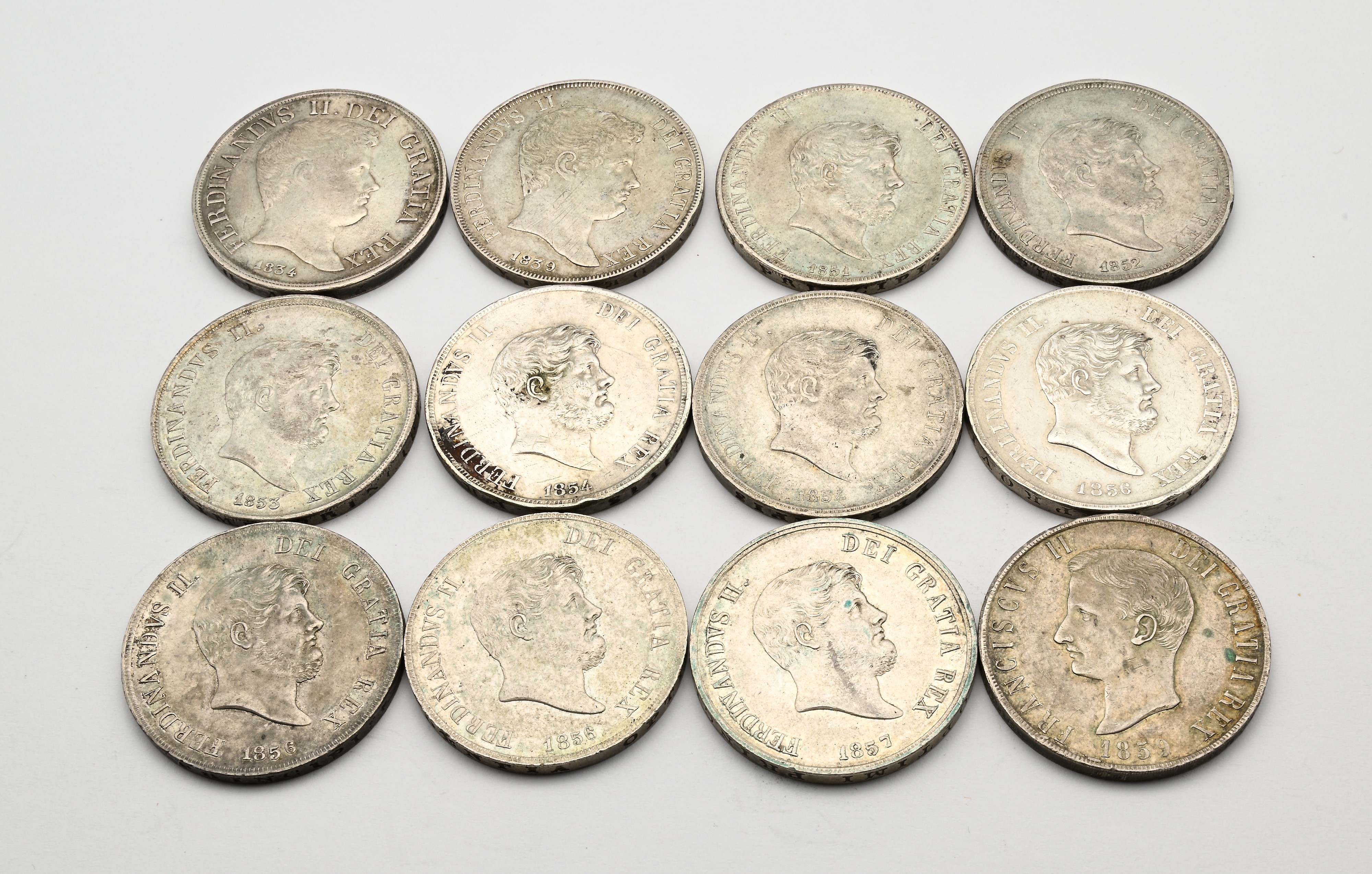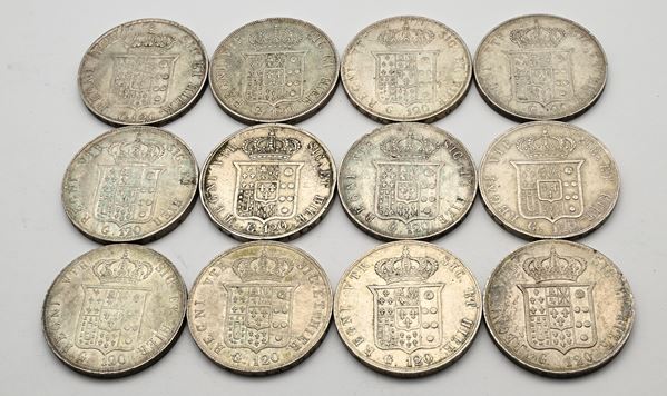 Lotto di 12 Piastre da 120 Grana: del 1° tipo 1834, del 2° tipo 1839, del 6° tipo 1851, 1852, 1853, 1854 (2), 1856 (3), 1857 Ferdinando II di Borbone; 1859 Francesco II di Borbone Regno delle 2 Sicilie