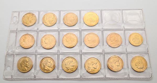 Lotto di 13 monete da 20 franchi Francia (1854 e 1865 Parigi, 1906, 1907 e 1908); Svizzera (1899, 1914, 1922 e 1947 (2); e Belgio (1869, 1870 e 1875) 10 Corone 1912 e 20 corone 1915 Francesco Giuseppe Impero Austriaco; e 100 Piastre Turchia