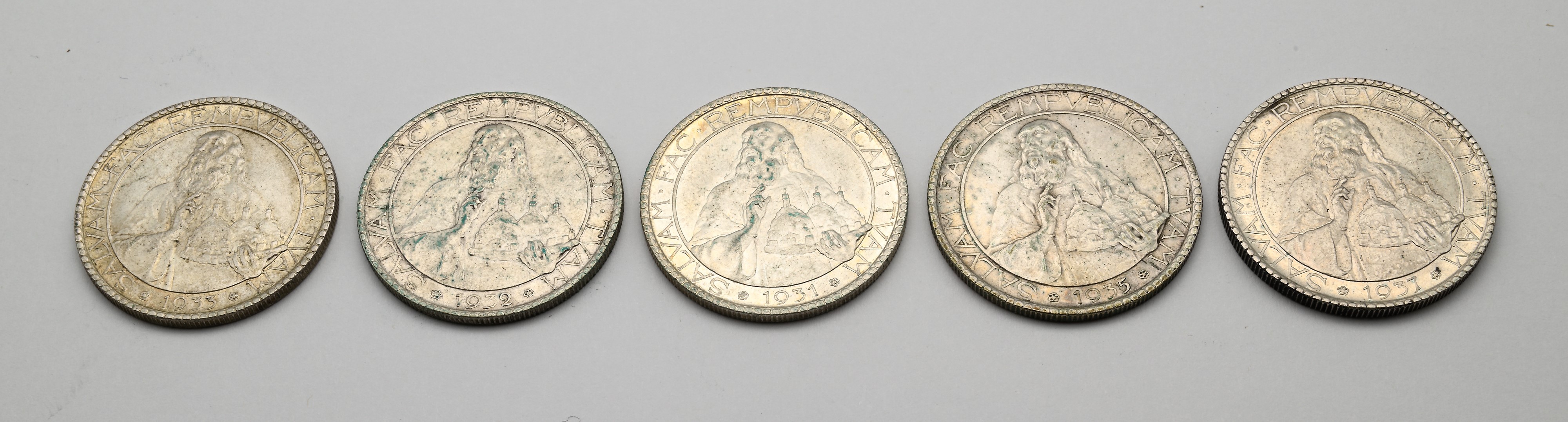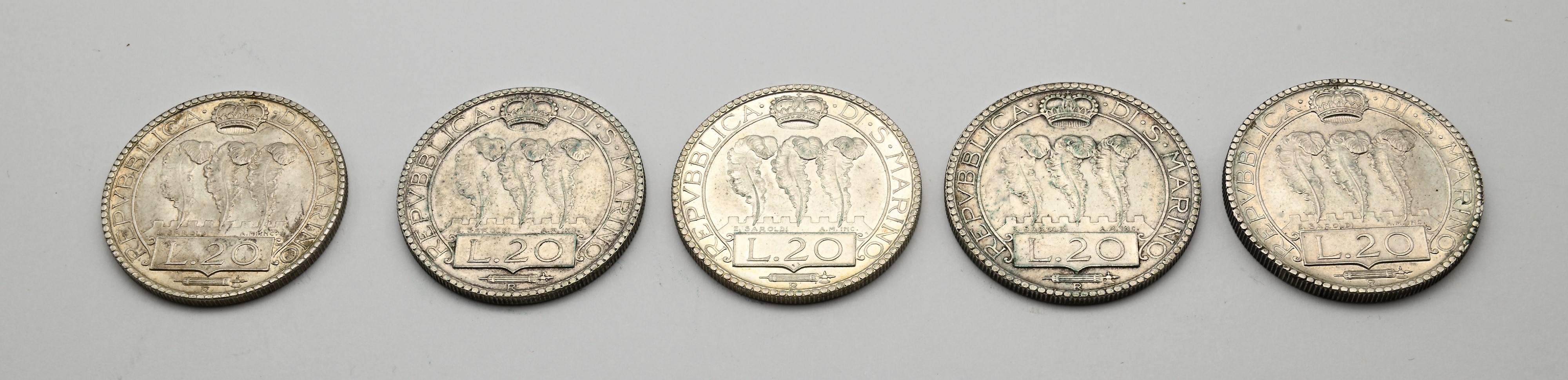 Lotto di 5 monete da 20 lire 1931, 1932, 1933, 1935 e 1937 Repubblica di San Marino