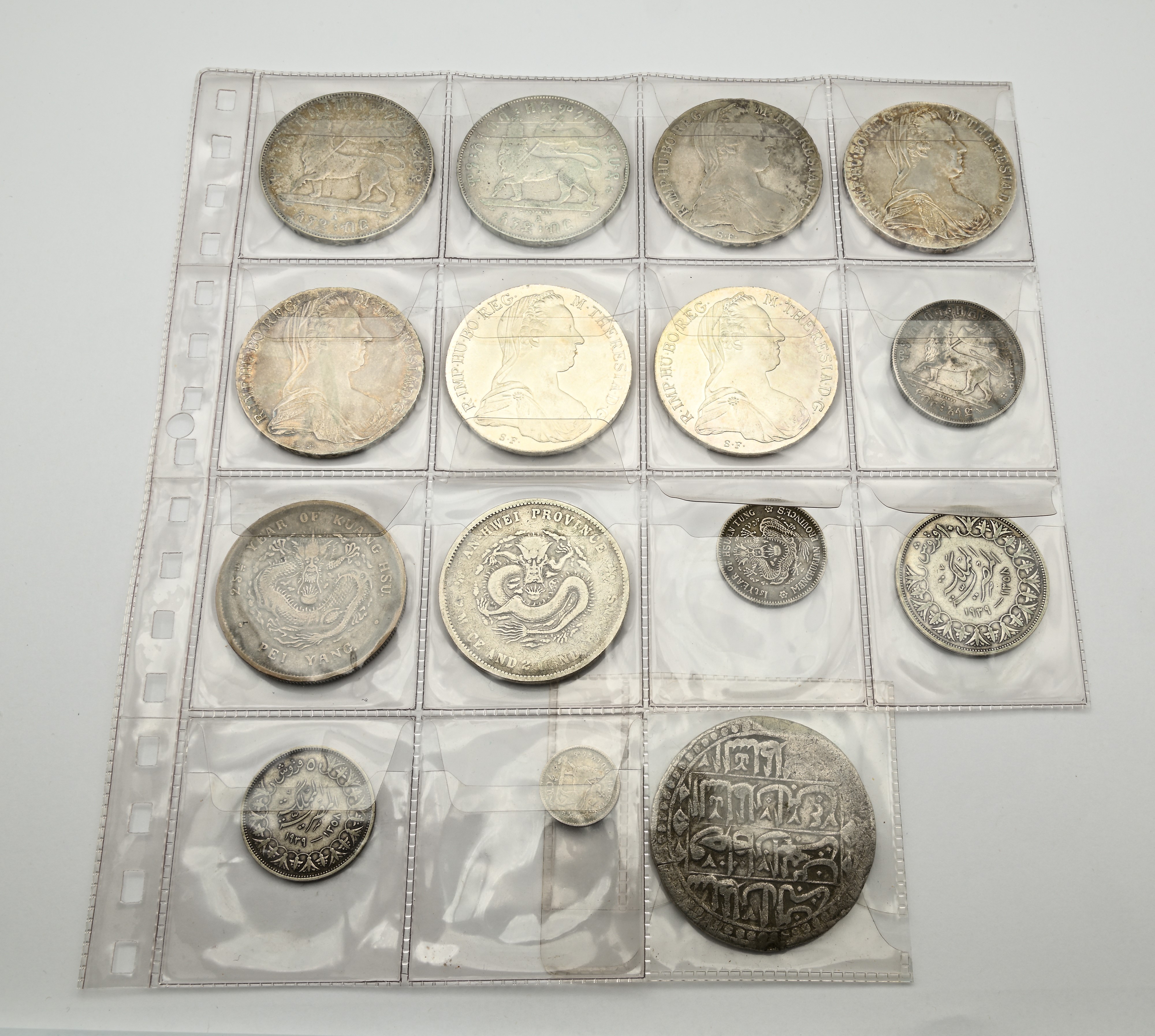 Lotto monete: Dollaro 1897 Provincia Anhwei, Dollaro 1899 Provincia Chihli, 20 Cents Provincia Manciuria Impero della Cina; Bir (2) 1889A (1897), 1/2 Bir e 1/20 di Bir Etiopia; 5 Talleri di Maria Teresa, 10 e 5 Piastre Regno d'Egitto; e Yuzluk Impero Ottomano