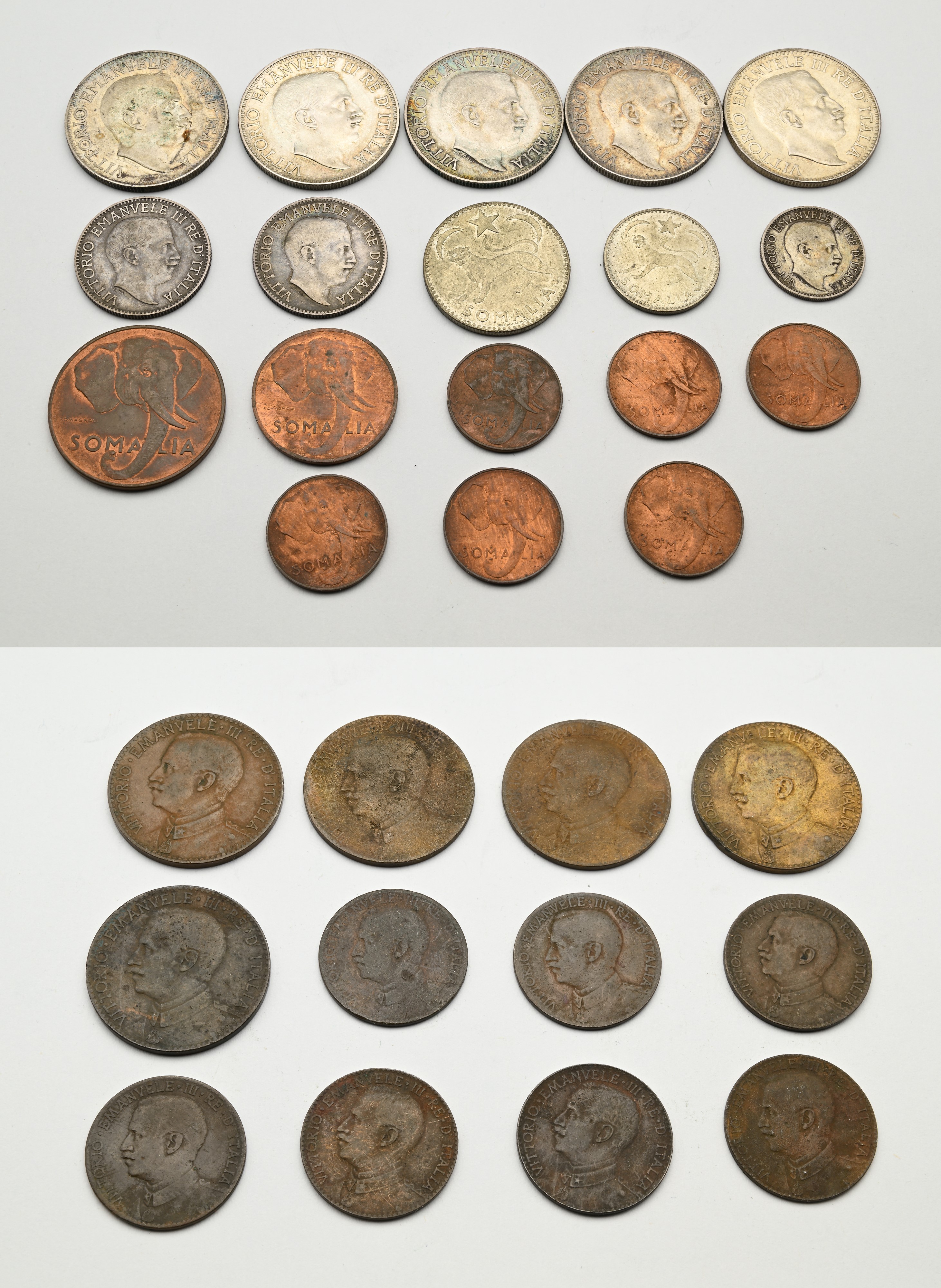 Lotto Somalia Italiana Vittorio Emanuele III - 1 Rupia 1910, 1912, 1913, 1915 e 1919; Mezza Rupia 1910 e 1913; 1/4 di Rupia 1910; 4 Bese 1909 (2), 1910, 1921 e 1923; 2 Bese 1909 (2), 1910, 1913, 1921, 1924 (2); 1 Somalo, 50, 10, 5 e 1 Cts. (6) 1950 Somalia AFIS