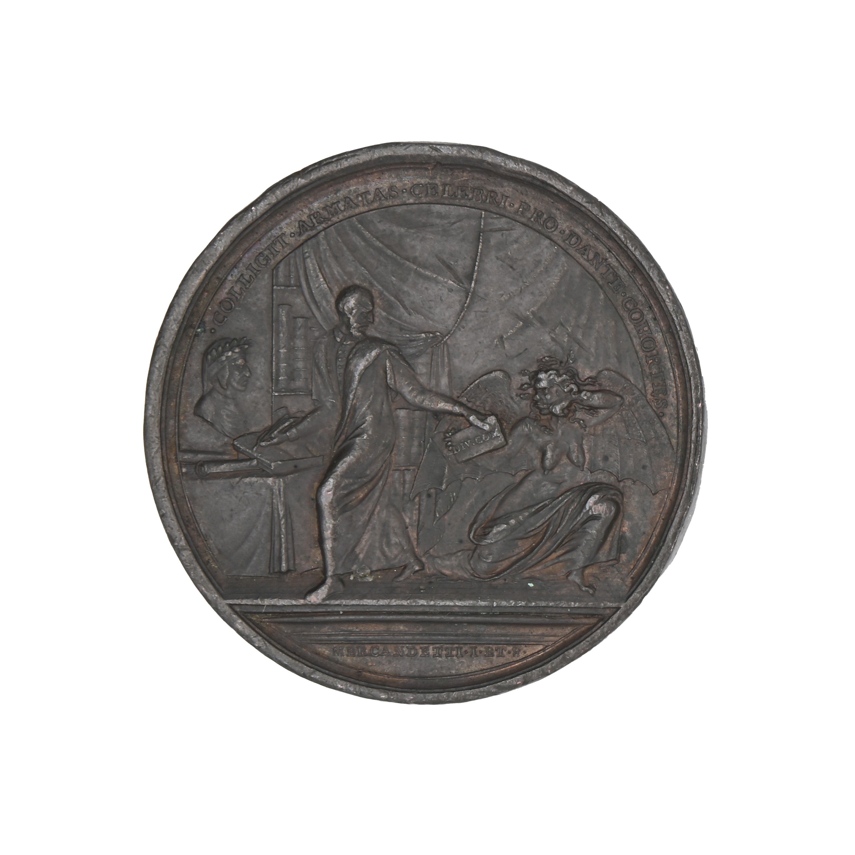 Medaglia in bronzo commemorativa di Jacopo Mazzoni (1548-1598); datata 1809 e firmata Mercandetti - D/ Busto con bavero e pelliccia IACOBVS MAZZONI sotto MERCANDETTI F. ROMAE MDCCCIX R/ Scena allegorica col Mazzoni in piedi, presso uno scrittoio col busto di Dante, mentre scrive e riceve da medusa alata una tavoletta COLLIGIT•ARMATAS•CELEBRI•PRO•DANTE•COHORTES