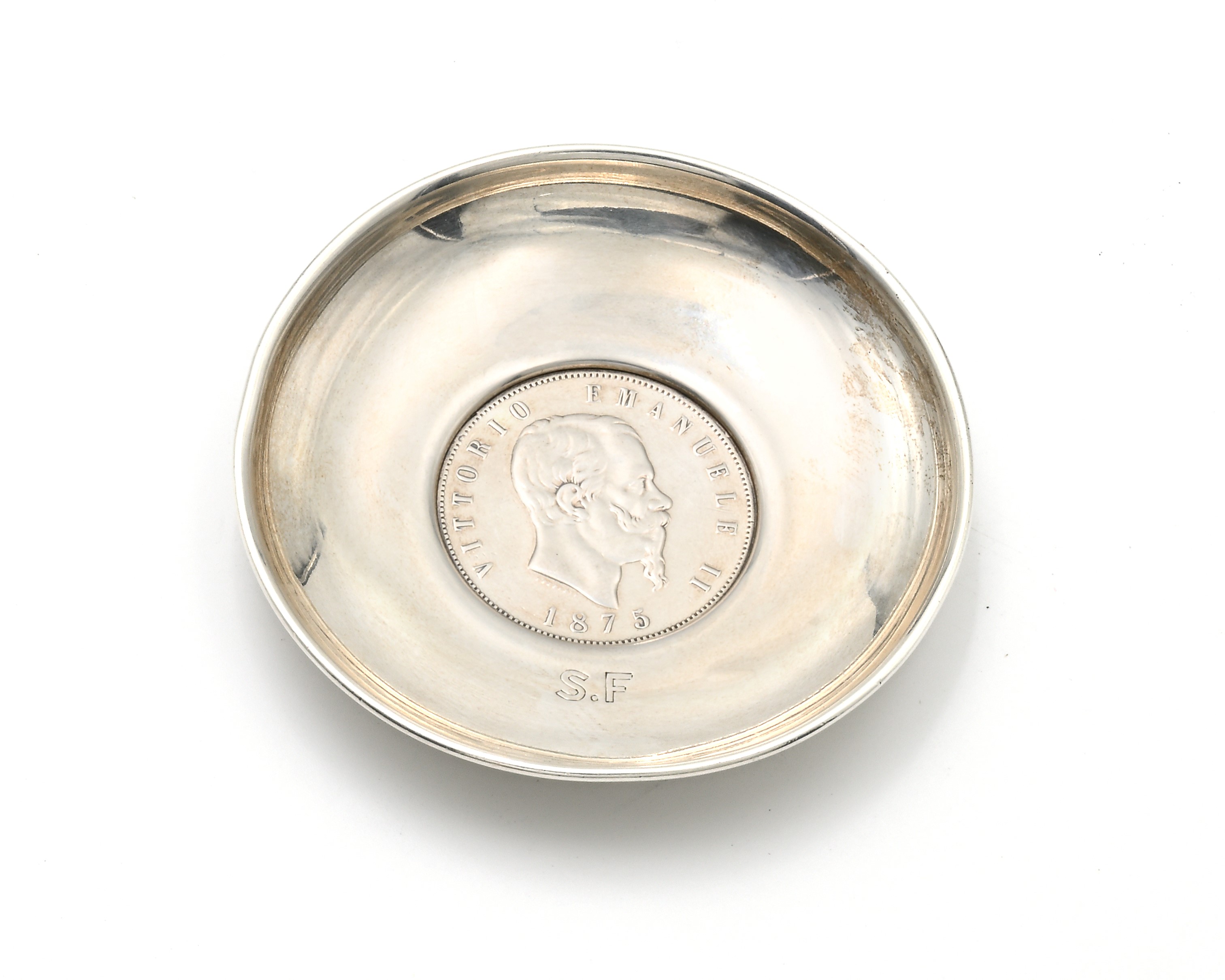 Piattino in argento 925/000 con al centro 5 Lire 1875 M Regno d'Italia Vittorio Emanuele II