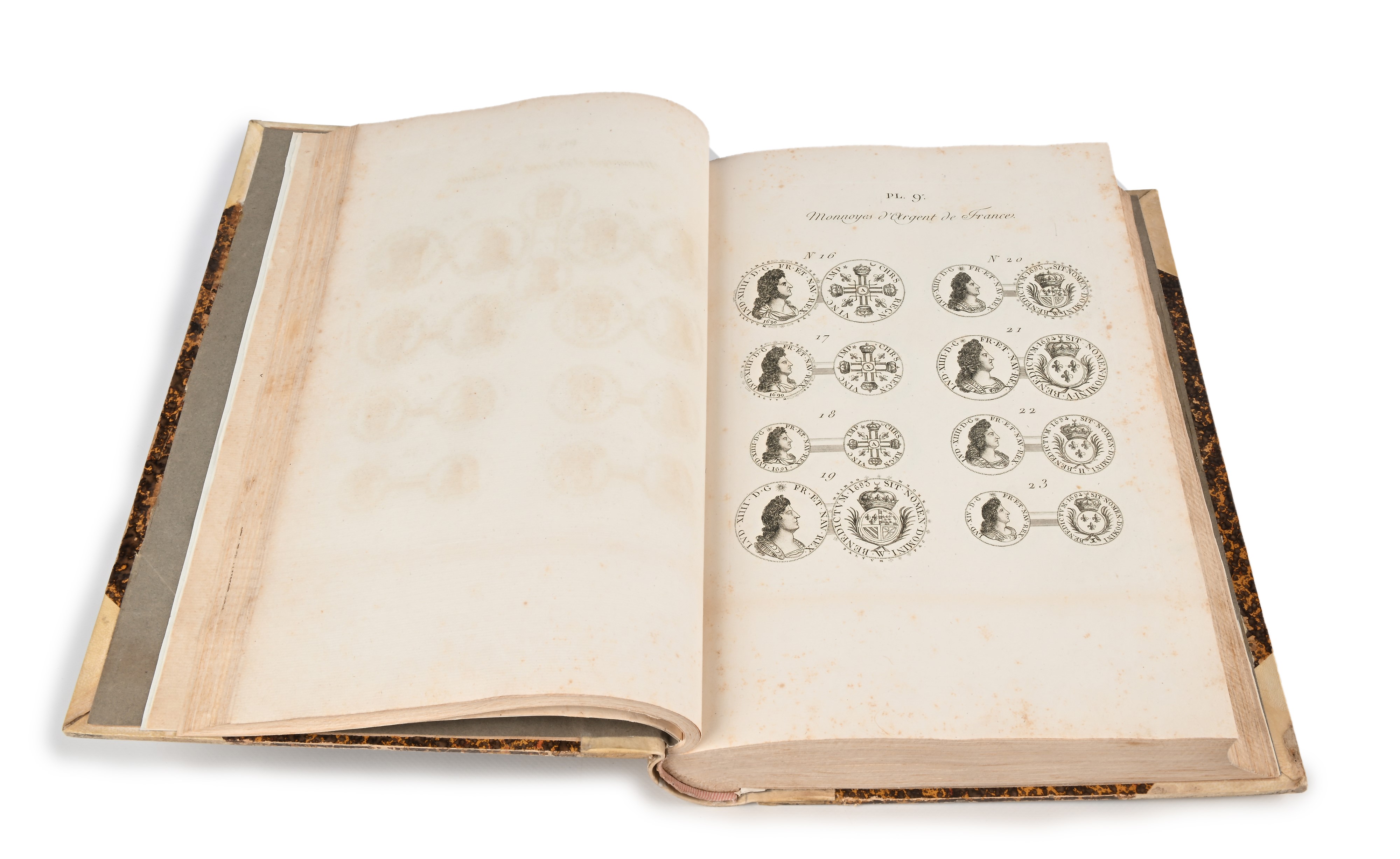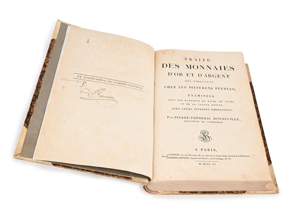 In folio. Monumentale opera in prima edizione illustrata di Pierre-Frédéric Bonneville, agente della Banque de France, che scrisse e pubblicò quest'opera sotto il patrocinio di Napoleone per le banche e le case di cambio. Questo libro diventerà subito un'opera di riferimento con la descrizione di tutte le valute in vigore nei diversi paesi del mondo compresa l'America. Illustrato con quasi 3.000 diverse monete distribuite in 188 tavole ed 1 vignetta (17 Francia, 1 Lorena, 4 Paesi Bassi austriaci, 6 Olanda, 10 Spagna, 6 Portogallo, 14 Svizzera e Neufchâtel, 1 Ginevra, 6 Piemonte & Sardegna, 4 Genova e Liguria, 4 Parma e Milano, 4 Venezia, 6 Toscana, 1 Lucca, 14 Roma, 3 Bologna, 6 Napoli, 2 Malta, 6 Austria, 6 Baviera, 3 Svevia, 5 Franconia, 5 e 8 Sassonia, 2 Westfalia, 8 Renania, 4 Prussia, 1 Polonia, 4 Danimarca e Norvegia, 3 Svezia, 4 Inghilterra, 5 Russia, 1 Ragusa, 6 Turchia, Crimea e Sierra Leone, 6 Persia e India, 2 Stati Uniti d'America). Comprende oltre l'Appendice anche l'Errata corrige la Tabella alfabetica. Legatura in mezza pergamena ottocentesca con angoli e titolo con filettature impresse al dorso.