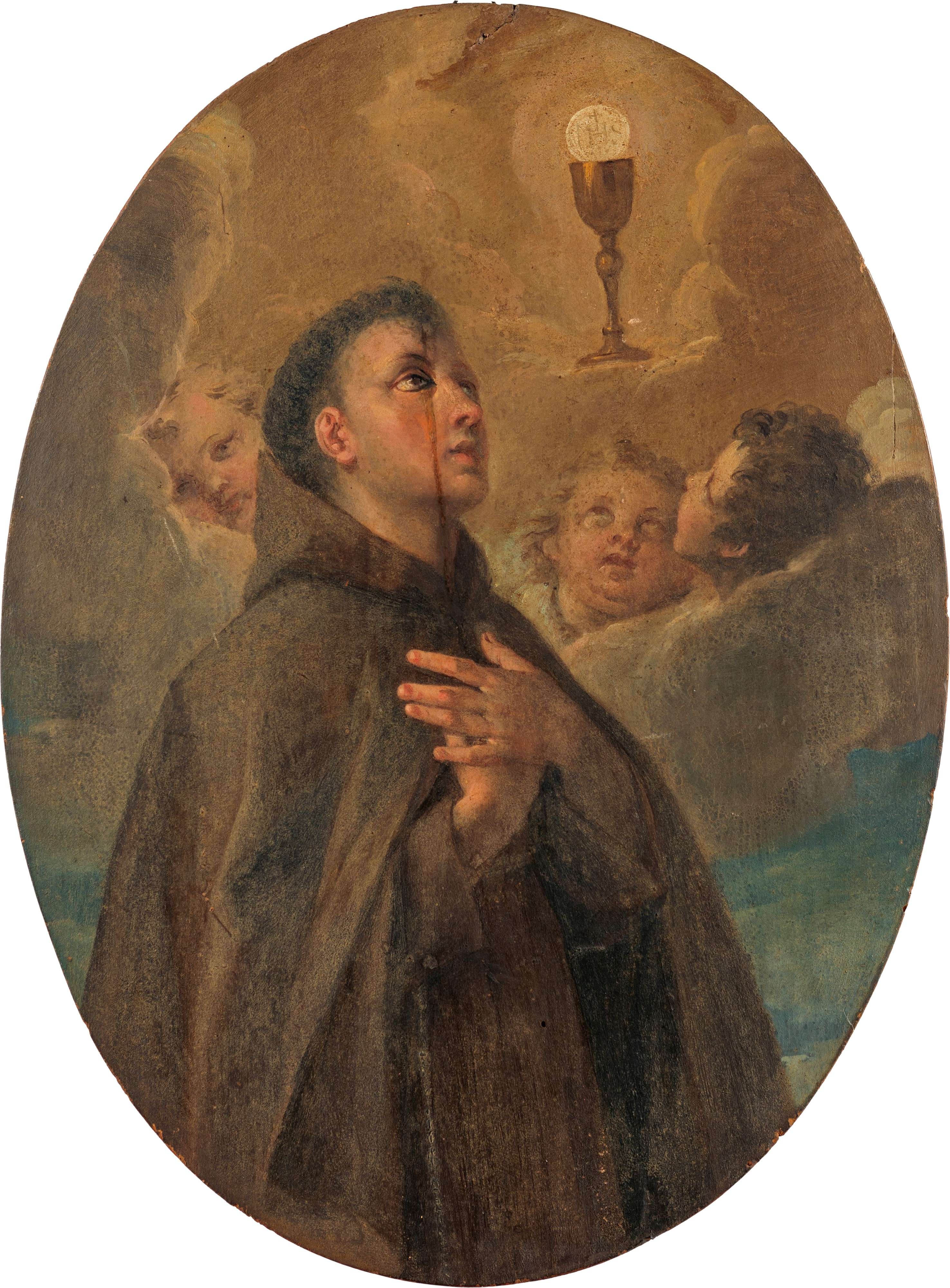 San Pasquale, religioso e mistico spagnolo dell'Ordine dei Frati Minori Alcantarini, soprannominato 'teologo dell'Eucaristia' per il suo impegno nella difesa del Sacramento eucaristico, è raffigurato nell'atto di adorare il Santissimo Sacramento, circondato dagli angeli.