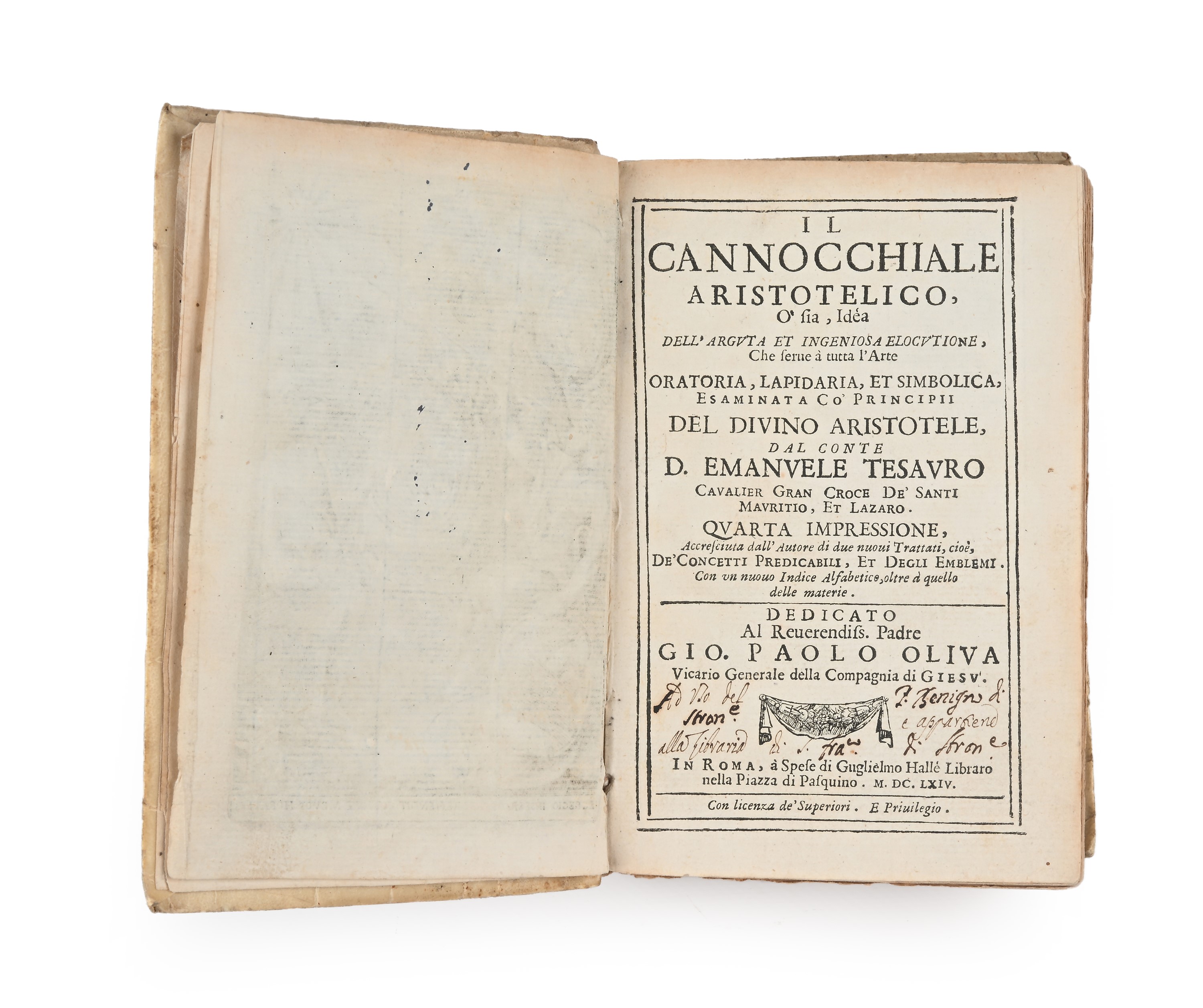 In 8o. Due ritratti calcografici, del dedicatario Giovanni Paolo Oliva e dell'Autore, entrambi firmati da Benoît Thiboust. Edizione romana in quarta impressione, successiva di dieci anni alla prima del 1654, dell'importante trattato del filosofo e storico subalpino. Raro trattato seicentesco di semiotica; opera celebrativa del divino potere dell'"Argutezza", divertente e divertita, relativa a emblemi, imprese, tutta focalizzata sulle figure retoriche, "anagrammi letterali o numerici"; "allitterazioni serie e ridicole"; antitesi; motti di guerra; proverbi; reticenze; allegorie; apologhi; indovinelli; iscrizioni; con già nel titolo un richiamo a un oggetto di recente invenzione ma ricalibrato su Aristotele anziché su Galileo. Legatura coeva in piena pergamena con titolo manoscritto al dorso.