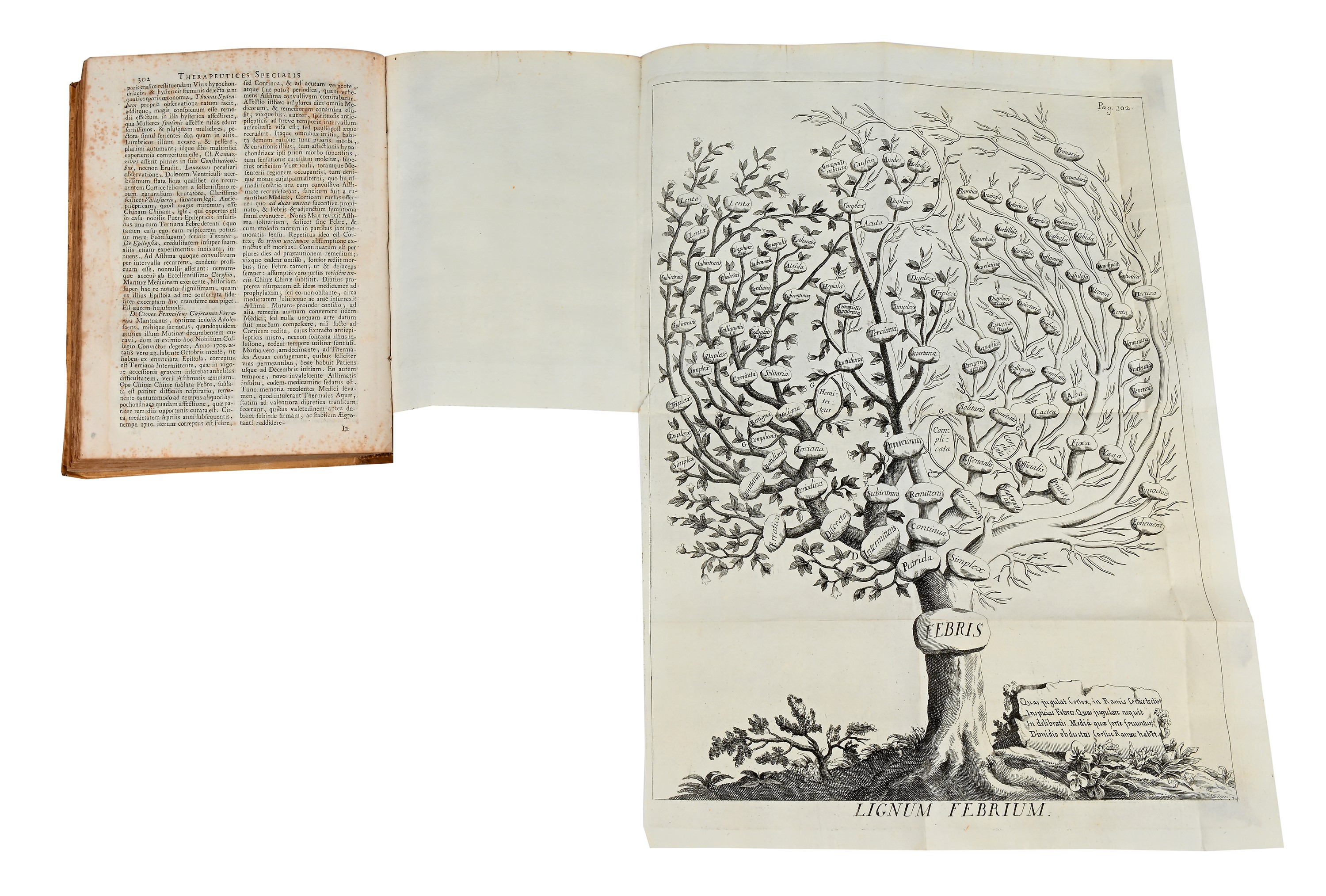In 4o Quarta edizione dell'opera del celebre medico modenese, difensore degli effetti terapeutici della china sulle febbri malariche intermittenti, pubblicato per la prima volta nel 1709 a Modena ed accolto in tutta Europa con favore straordinario al punto che a questo libro si attribuisce la vittoria definitiva della corteccia di china. Antiporta figurata col ritratto dell'autore inciso in rame in ovale e 1 tavola più volte ripiegata a forma di albero genealogico sulla evoluzione della febbre. Legatura coeva in piena pergamena con titolo manoscritto al dorso.