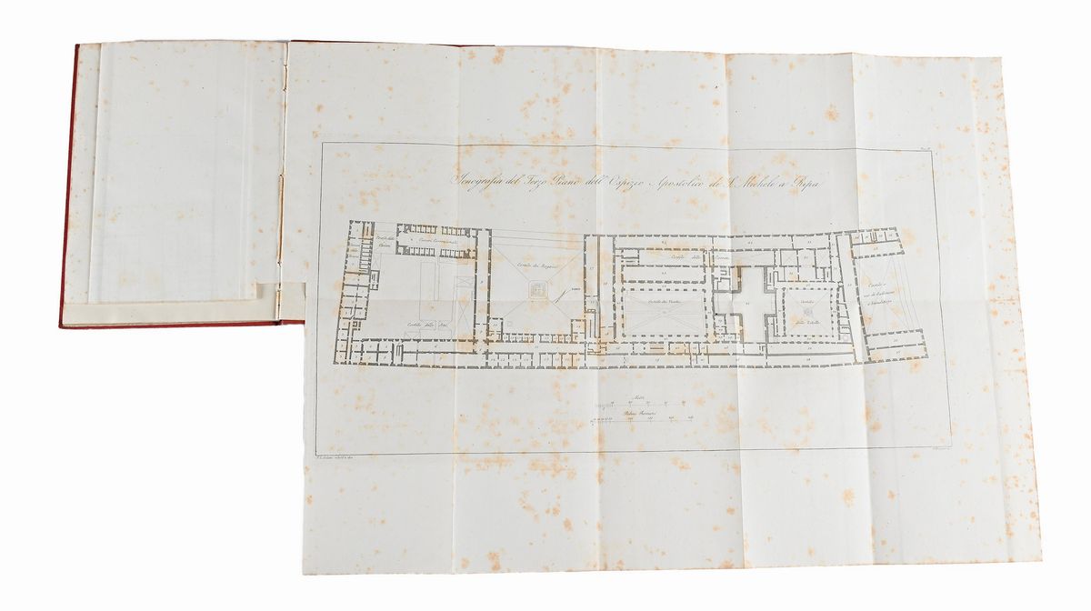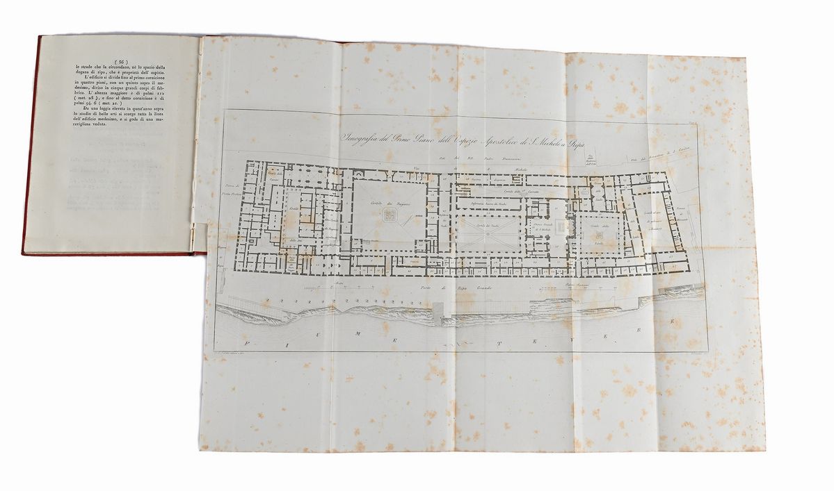 In 4° Nuova edizione della Storia dell'Ospizio di San Michele a Roma del Tosti, illustrata con due grandi planimetrie del complesso architettonico ripiegate più volte. Legatura coeva in tela.