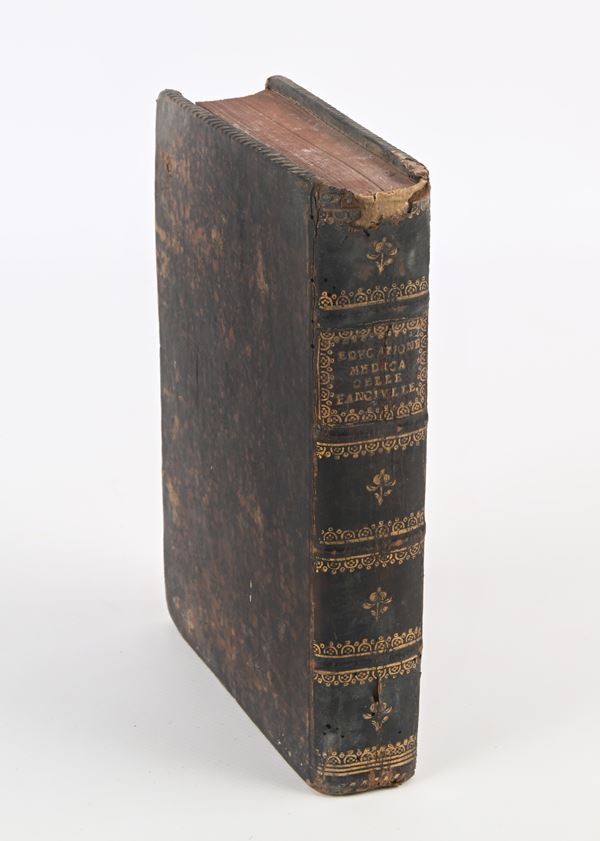 Antiporta figurato. Legatura in pieno vitello marazzato a 4 nervi, con titoli e fregi in oro al dorso