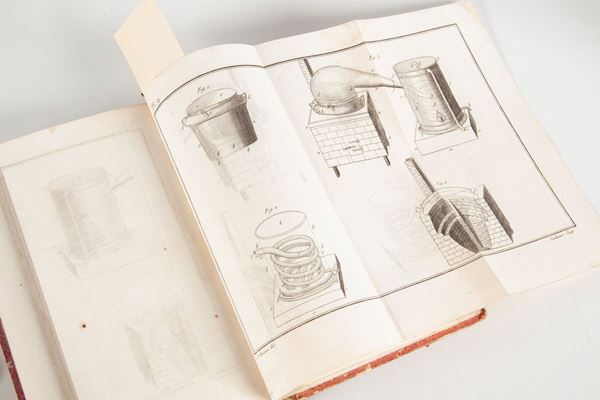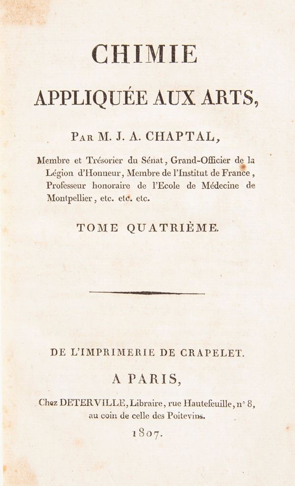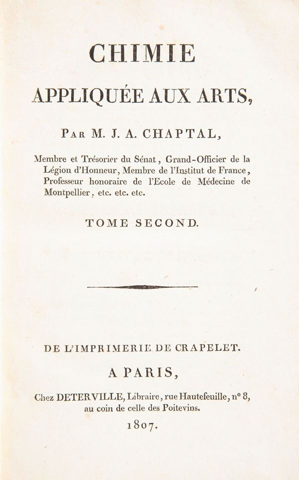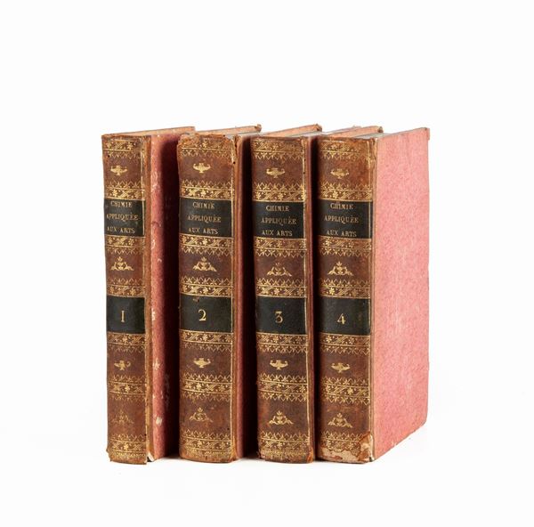 4 Volumi in 8°. Importante opera in quattro volumi del chimico, medico e politico francese Jean-Antoine Chaptal, membro e tesoriere del Senato, Grande Ufficiale della Legion d'Onore, Membro dell'Institut de France, professore onorario della Scuola di Medicina di Montpellier. Dedicata "A Sua Maestà l'Imperatore e Re" poiché venne incaricato da Napoleone I e poi da Luigi XVIII, di sviluppare l'industria francese e di adattarla alle nuove scoperte della scienza, consiglia agli industriali di incoraggiare la ricerca scientifica all'interno delle loro aziende: “La scienza viene in aiuto dell’industria e l’industria alla scienza”. Ricordiamo per inciso che Chaptal creò una fabbrica di prodotti chimici che diede per la prima volta al commercio francese alcuni nuovi prodotti come l'acido solforico, l'allume artificiale, ecc. Legatura in mezza pelle coeva con titoli su tasselli e fregi in oro ai dorsi