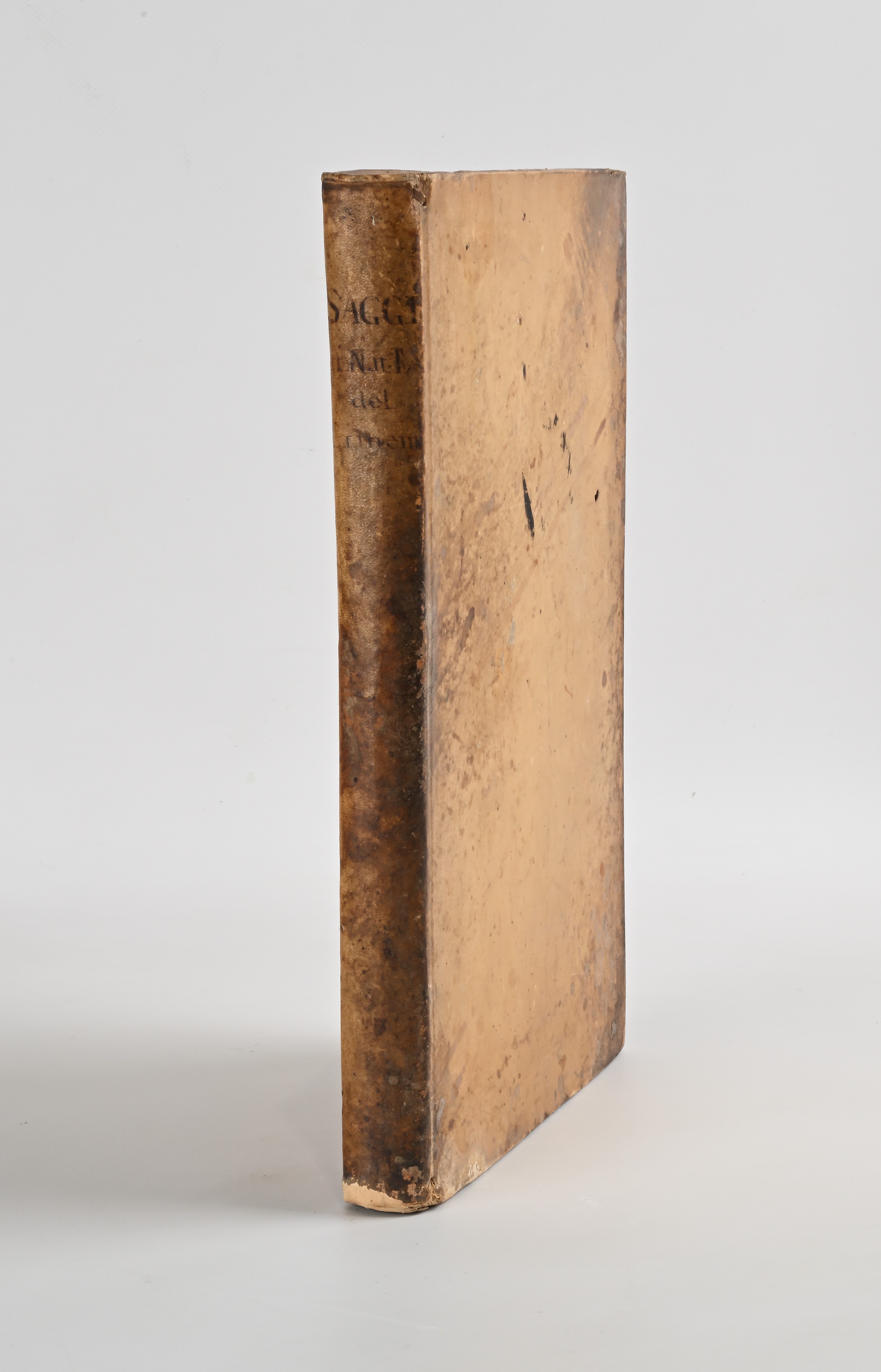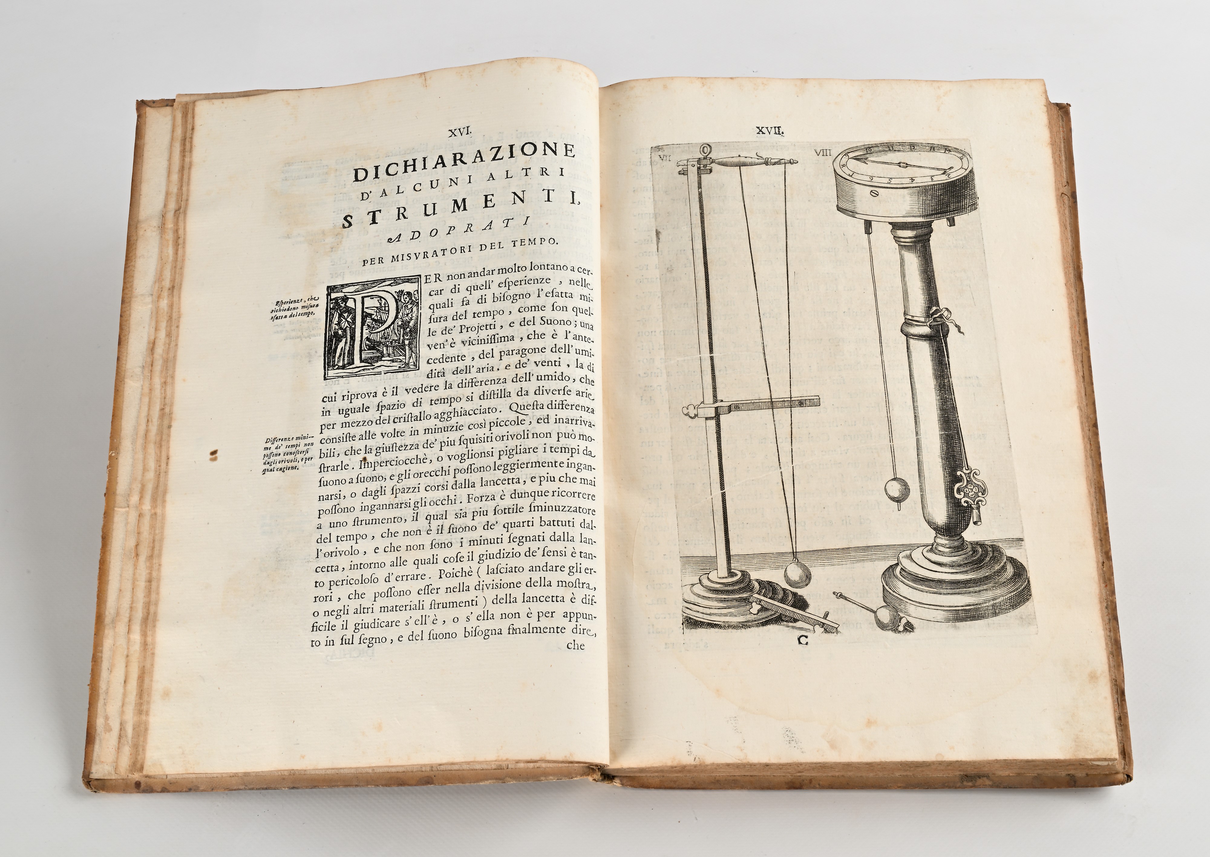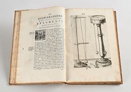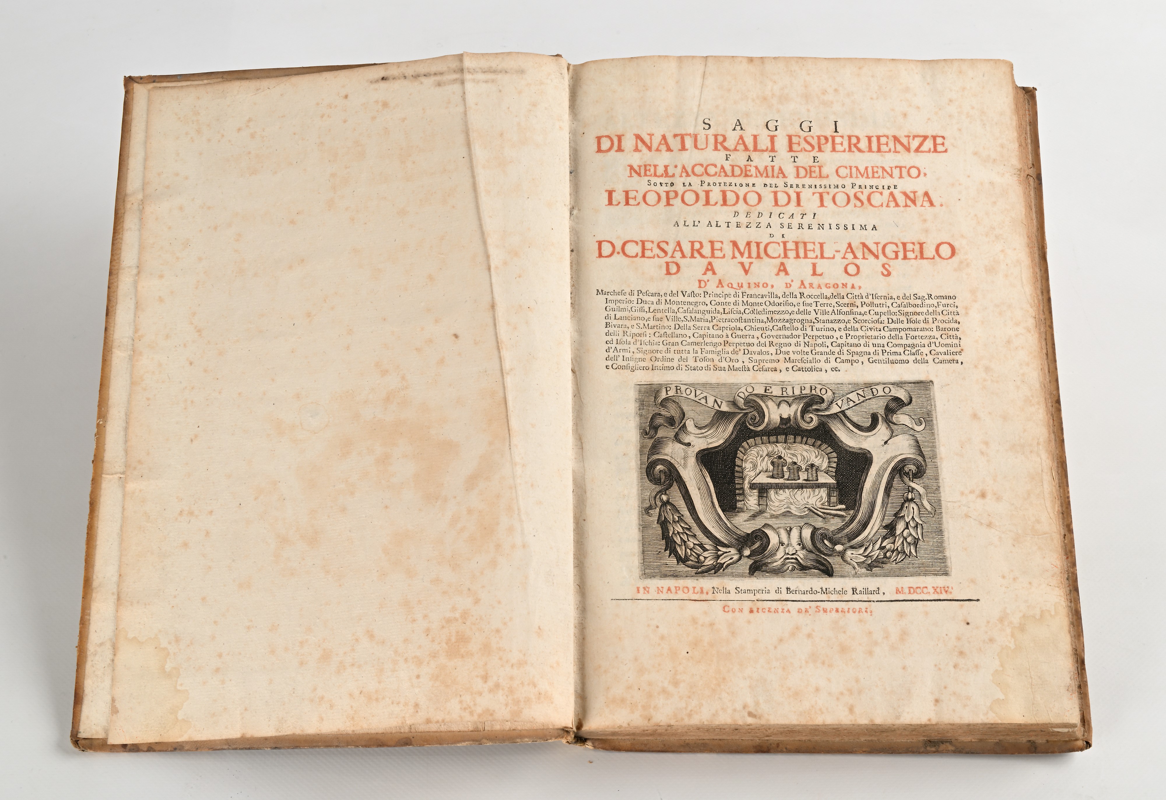 In 2° Quinta edizione italiana e seconda stampata a Napoli illustrata completa delle 75 incisioni nel testo a piena pagina. La prima edizione è di Firenze 1667 cui seguirono nel Sei e Settecento diverse edizioni e traduzioni sempre a Firenze e a Venezia, Napoli, Londra, Parigi, Leida, Vienna, della raccolta dei lavori sperimentali compiuti dalla fiorentina Accademia del Cimento dalla sua fondazione nel 1657 al 1667. Fondata da Leopoldo de’ Medici e dal granduca Ferdinando II fu la prima società europea con finalità esclusivamente scientifiche, seguendo la lezione di Galileo. Carte macchiate e fioriture marginali. Legatura in piena pergamena coeva con titolo manoscritto al dorso