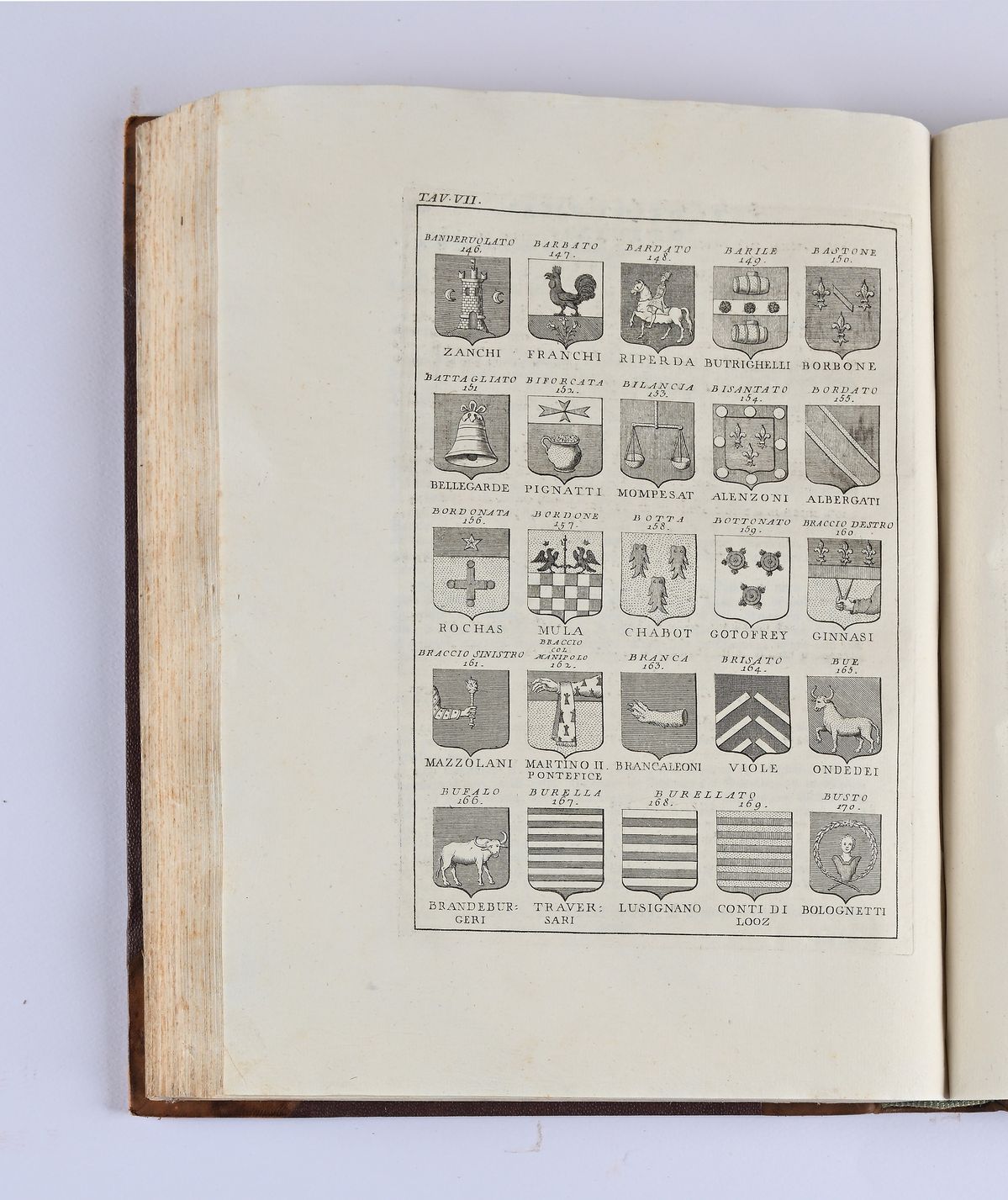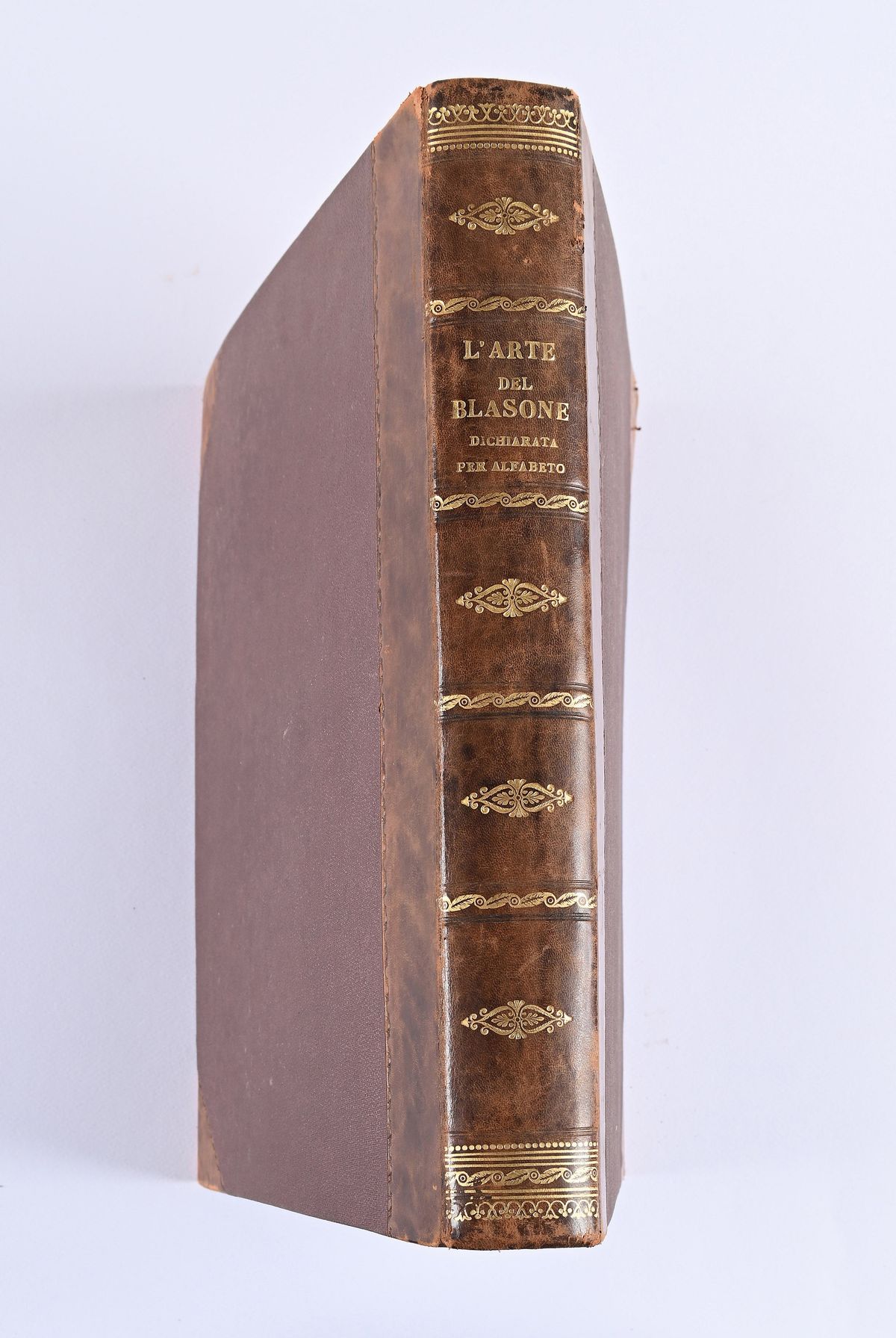 In Folio. Edizione originale di questo raro bellissimo figurato veneziano sull'araldica. Antiporta incisa raffigurante una scena di Torneamento di Pietro Monaco su disegno di Andrea Barbiani. Illustrato con 35 tavole fuori testo che contengono 881 blasoni di famiglie nobili italiane. Legatura tardo ottocentesca in mezza pelle e tela con angoli in pelle, titolo e fregi in oro al dorso.