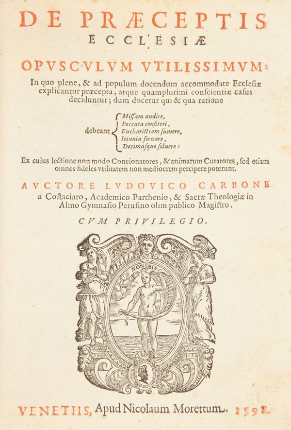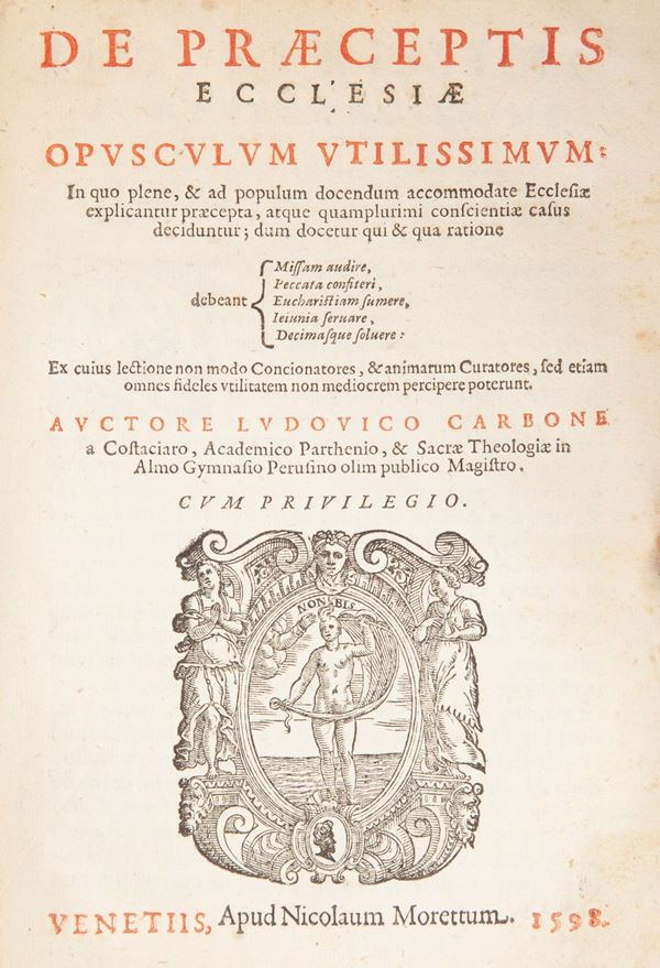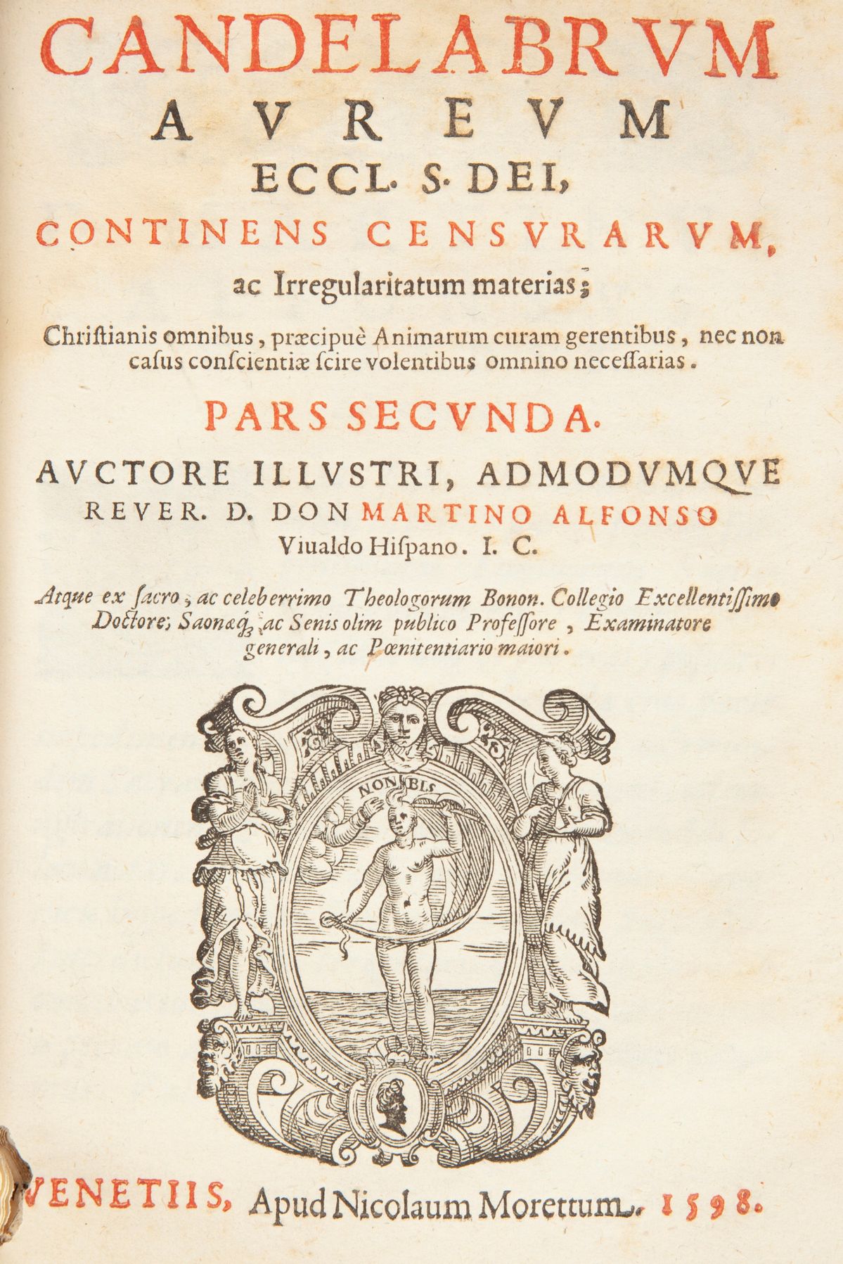 In 4° Importante opera tardo cinquecentesca di diritto canonico del frate domenicano spagnolo Martin Alfonso Vivaldo (1545 - 1605), pubblicata con una certa frequenza tra la fine del XVI e gli inizi del XVII secolo, qui in una delle prime edizioni veneziane. Legatura in piena pergamena del XVIII secolo con titolo in oro al dorso e con fregi a secco sui piatti. Tagli marmorizzati. Lavori di tarlo evidenti alla fine della Prima parte, all'inizio della Seconda (compreso il frontespizio) ed alla fine.