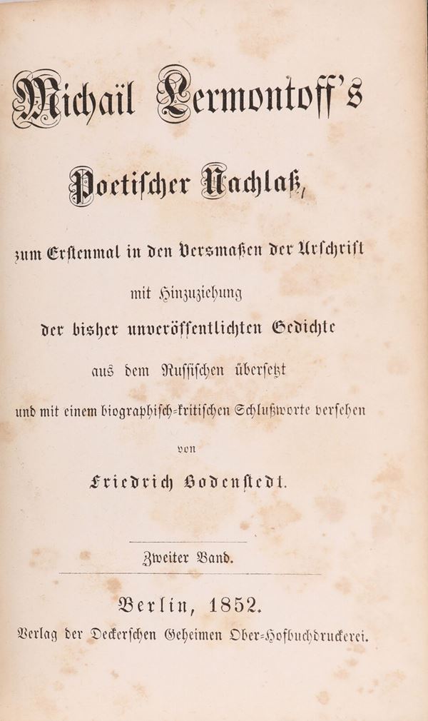 Mikhail Iurevich Lermontov. Poetischer Nachlass, Verlag der Deckerschen, Berlino 1852