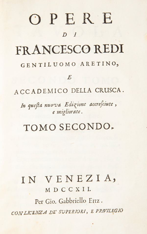 Opere di Francesco Redi gentiluomo aretino e accademico della Crusca In questa nuova edizione accresciute e migliorate. Tomo primo - Tomo secondo, Gabbriello Hertz, Venezia 1712