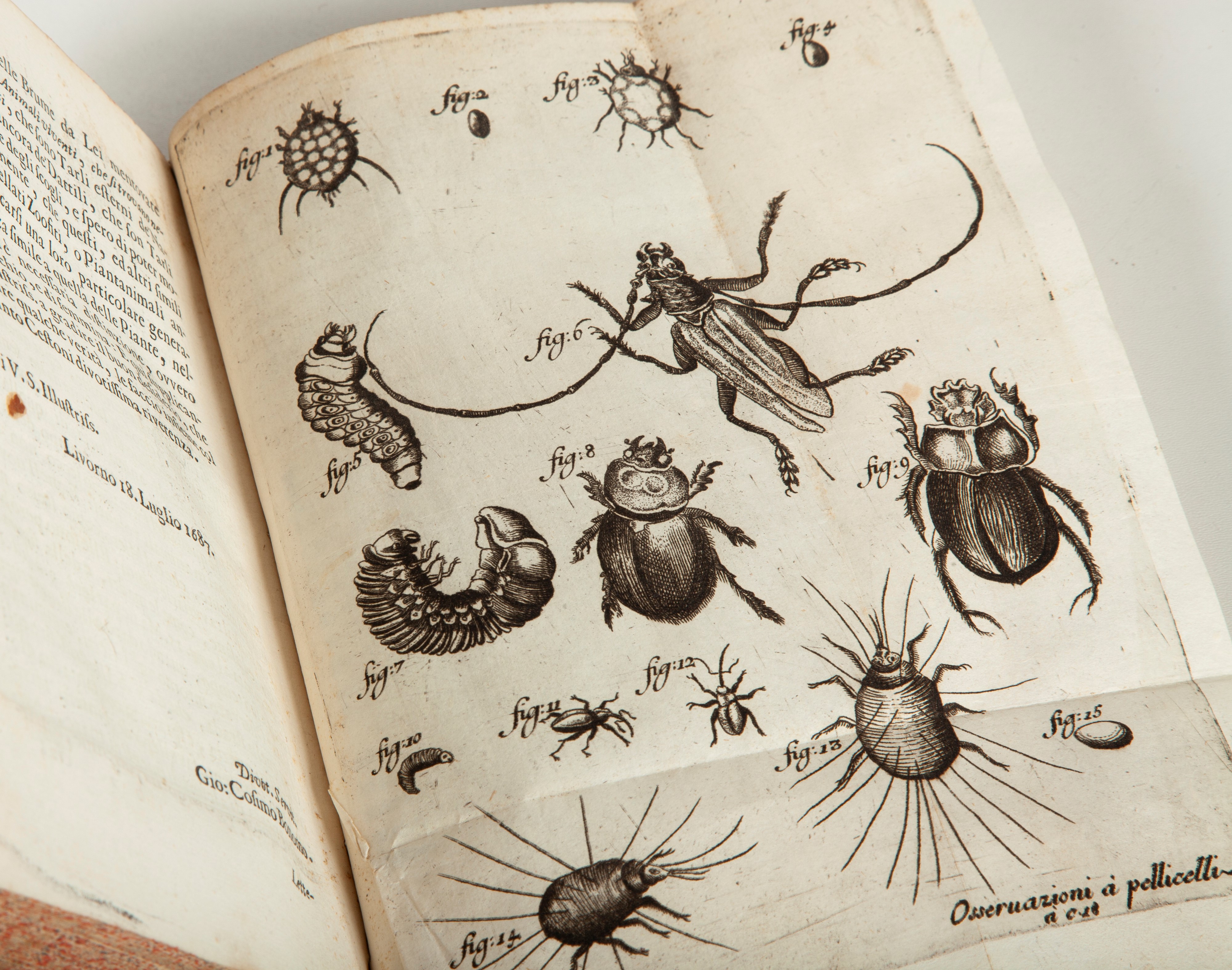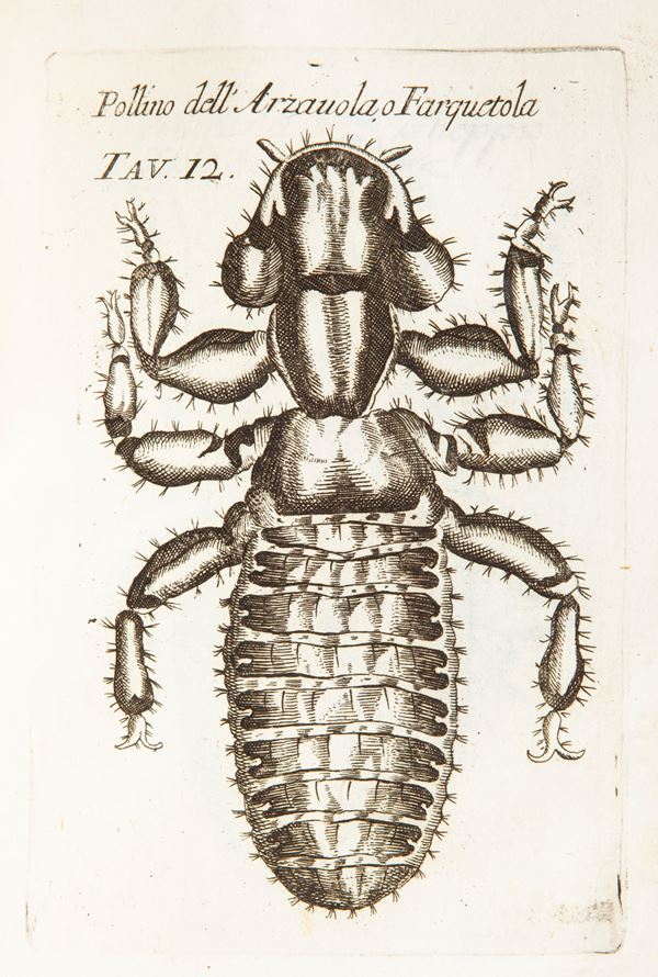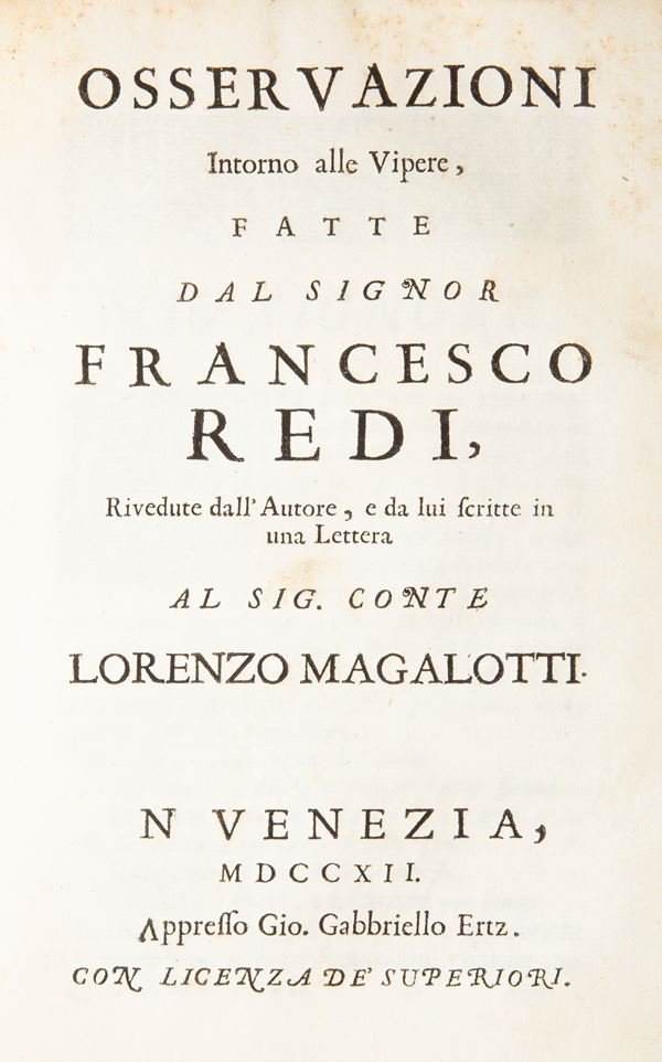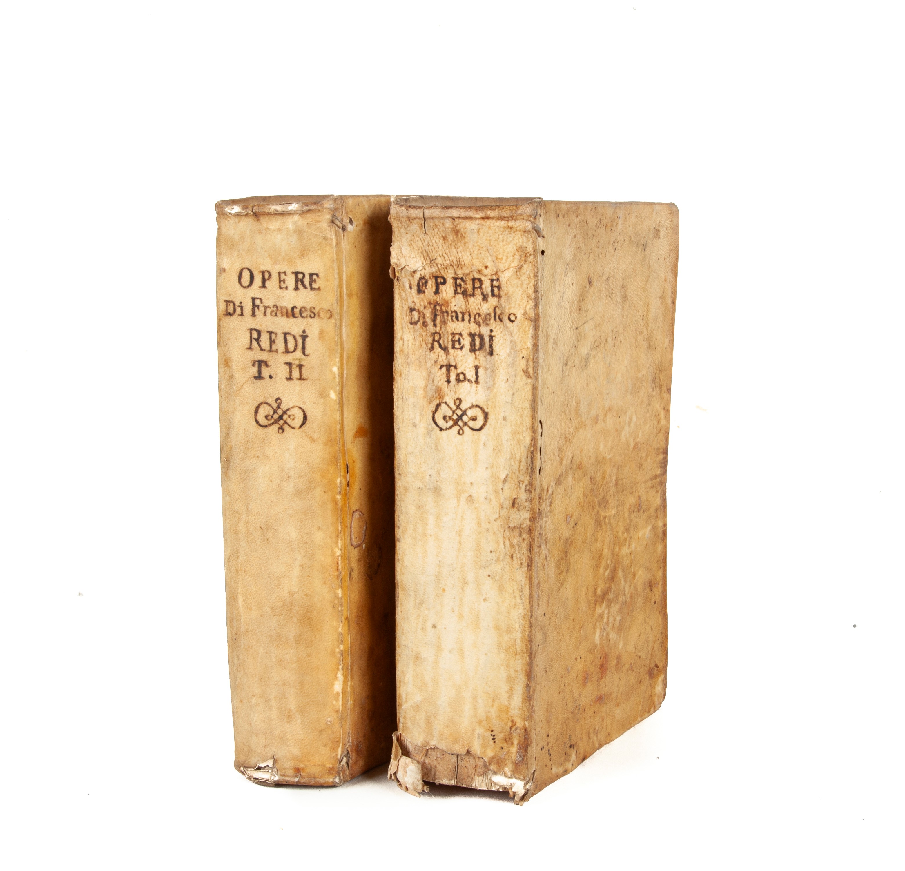In 8°. Solo Tomo I e II. Mancante del Tomo III. Prima edizione collettiva delle opere del Redi. Il Primo volume contiene ognuno con proprio frontespizio: Vita di Francesco Redi scritta dall Ab. Salvino Salvini, Orazion delle Lodi di Francesco Redi recitata nel suo funerale dal Sig. Anton-Maria Salvini, Esperienze intorno alla Generazione degl Insetti, Osservazioni intorno agli animali viventi che si trovano negli animali viventi, Osservazioni intorno a Pellicelli del corpo umano, Lettera del Sig. Giacinto Cestoni al Sig. Antonio Vallisnieri, Miglioramenti e correzioni d alcune esperienze e osservazioni del Redi fatte dal Sig. Antonio Vallisnieri. Il Secondo volume contiene ognuno col proprio frontespizio: Esperienze intorno a diverse cose naturali e particolarmente a quelle che ci son portate dall Indie, Osservazioni intorno alle vipere, Lettera sopra alcune opposizioni fatte alle Osservazioni intorno alle vipere, Osservazioni intorno a quelle gocciole e fili di vetro che rotte in qualsisia parte tutte quante si stritolano, Esperienze intorno a quell acqua che si dice che stagna subito tutti quanti i flussi del sangue che sgorgano da qualsisia parte del corpo, Lettera intorno all invenzione degli occhiali, Esperienze intorno a Sali fattizj, Lettera del Sig. Tommaso Platt d alcune esperienze intorno al veleno delle vipere, Lettere, Etimologie italiane. Riccamente illustrato a bulino da Girolamo Mattei. Legatura in piena pergamena coeva (con difetti ai dorsi) con titoli manoscritti ai dorsi, tagli spruzzati. Lavori di tarlo sui piatti del Secondo volume che non interessano il corpo del libro.