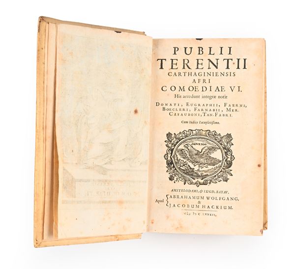 In 8°. 2 Tomi in un volume. Antiporta illustrato con incisione raffigurante una dea che toglie una maschera drammatica dal volto di Terenzio, con un busto di Terenzio sullo sfondo opera di Willem Van Mieris Edizione finale della Variorum la cui prima edizione fu compilata da Schrevelius e pubblicata a Lione nel 1644. Contiene l'intero commento di Donato con ampie note. Edizione la più copiosa e corretta. Si dice che Terenzio sia nato a Cartagine e sia stato schiavo fino alla sua liberazione poco dopo il suo arrivo a Roma. Tutte e sei le sue opere teatrali sono sopravvissute con i loro prologhi. Legatura in piena pergamena con titolo in oro su tassello in pelle.
