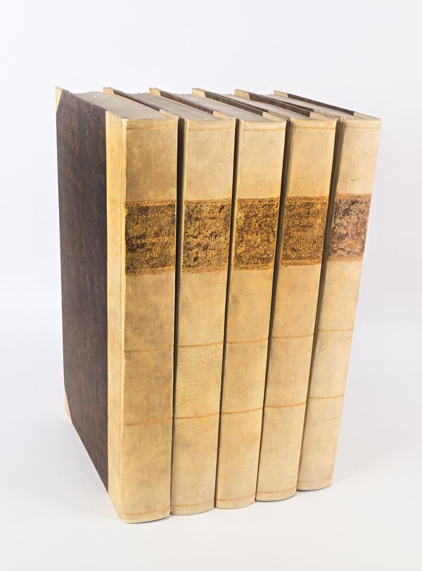 In Folio. X tomi in 5 voll. Sigerus Bernardus Espenius fu giureconsulto e canonista belga, professore a Lovanio e importante rappresentante del movimento giansenista. La sua difesa dei diritti dei re in materia ecclesiastica e le sue posizioni gli valsero l'accusa di giansenismo e lo costrinsero a lasciare la cattedra di Lovanio per quella di Leida. Le sue teorie sul regalismo provocarono la messa all'Indice della sua opera. Appoggiando un'ordinazione episcopale presso il vescovato di Utrecht venne considerato scismatico. Legature novecentesche in mezza pergamena con angoli in pergamena e titoli su tasselli ai dorsi