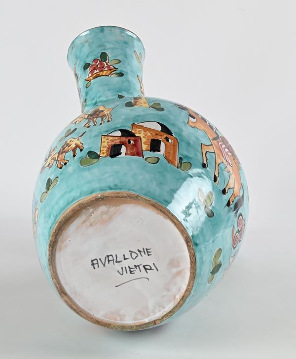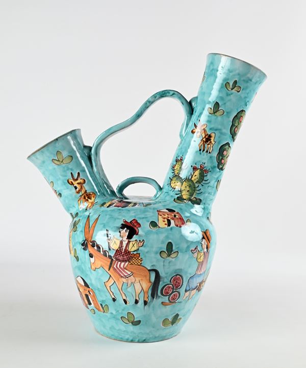Grande vaso versatoio in ceramica smaltata dipinta, manifattura Avallone, Vietri sul Mare