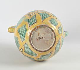 Decorato su fondo giallo con scene di combattimenti e lotta. Sotto la base reca la firma "Pinto, Vietri"