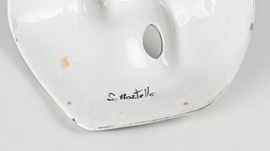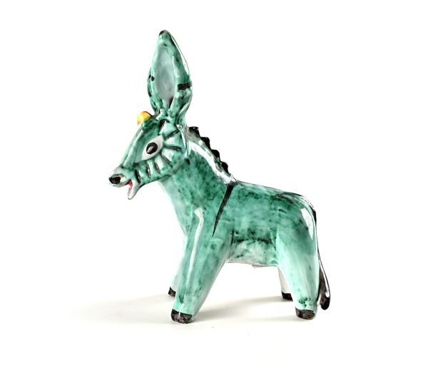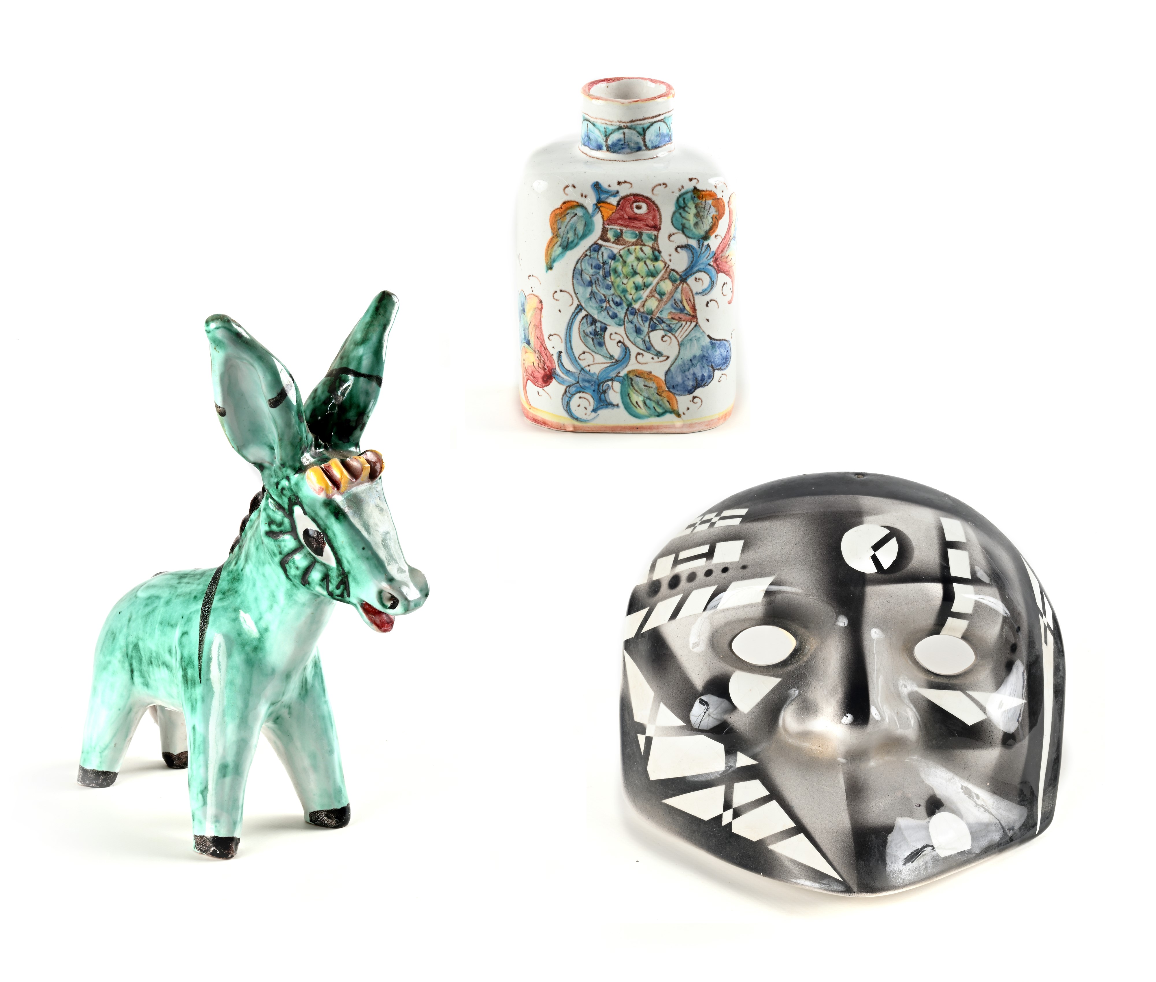 Lotto di una boccetta, una maschera ed un asinello in ceramica smaltata dipinta