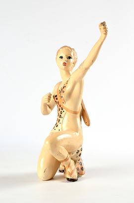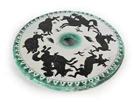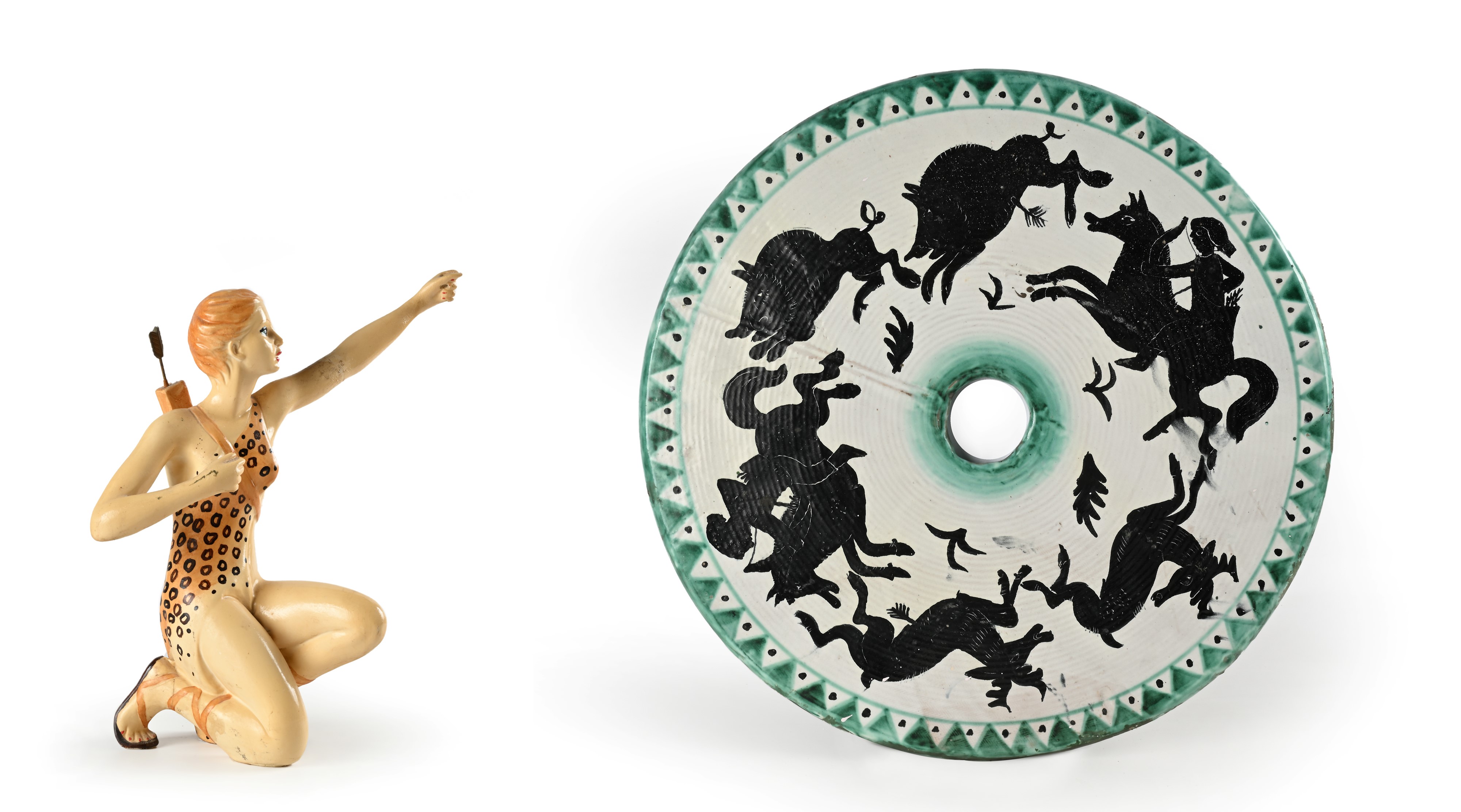 Lotto di una scultura in ceramica dipinta raffigurante Diana Cacciatrice e di un piatto in ceramica raffigurante Scena di caccia
