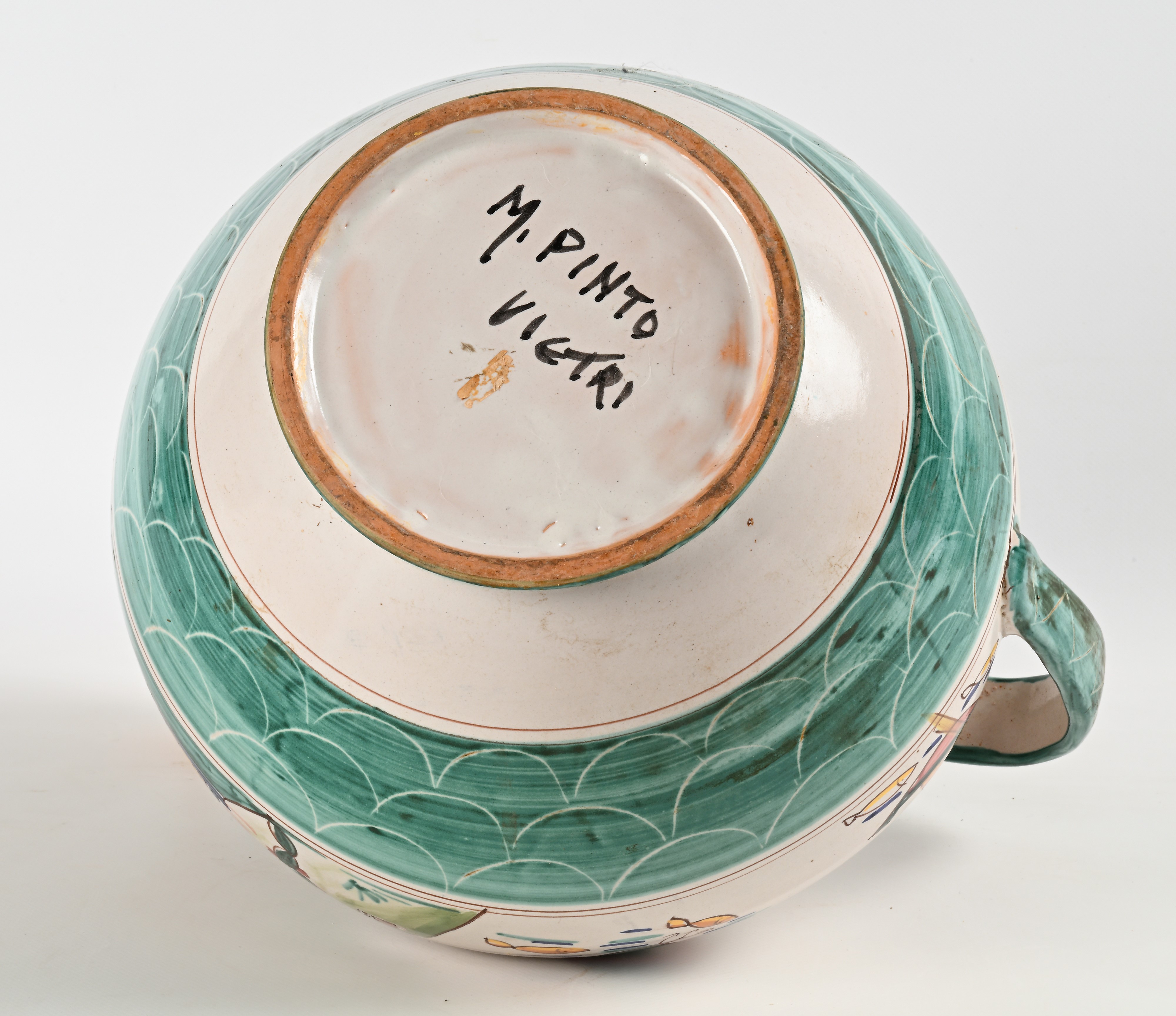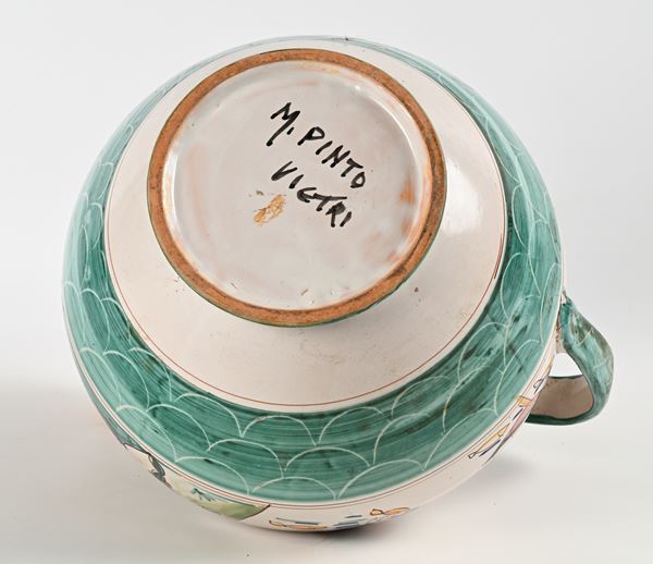 Finemente decorata con scene di pesca e veduta di paese, sotto la base reca firma "M. Pinto, Vietri".