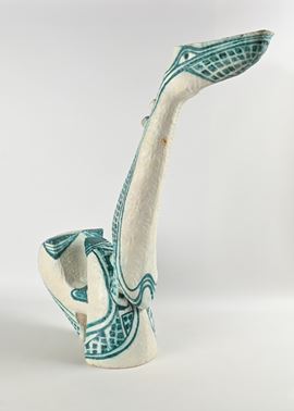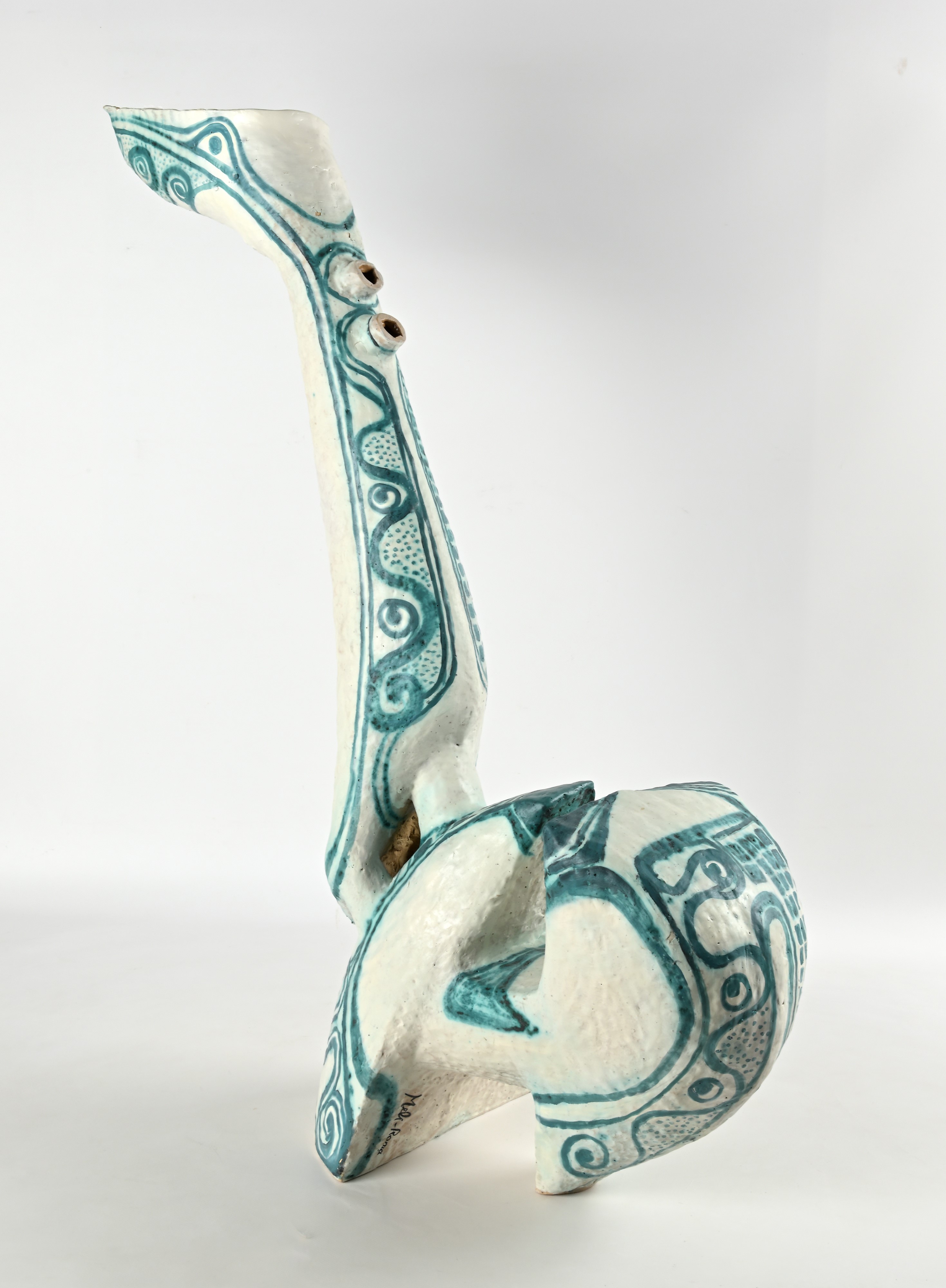 Scultura in terracotta modellata a forma di dinosauro e dipinta nei toni dell'azzurro e del bianco. Firma sulla gamba "Meli, Roma"