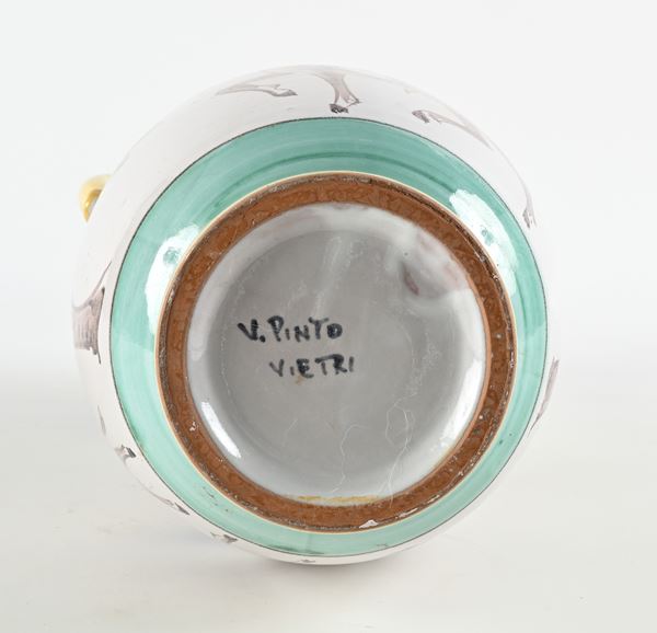 Decorata con alberi, popolani a cavallo di un mulo e signorotti a cavallo. Sotto la base reca la firma "V. Pinto, Vietri".