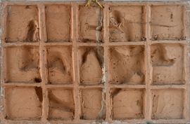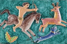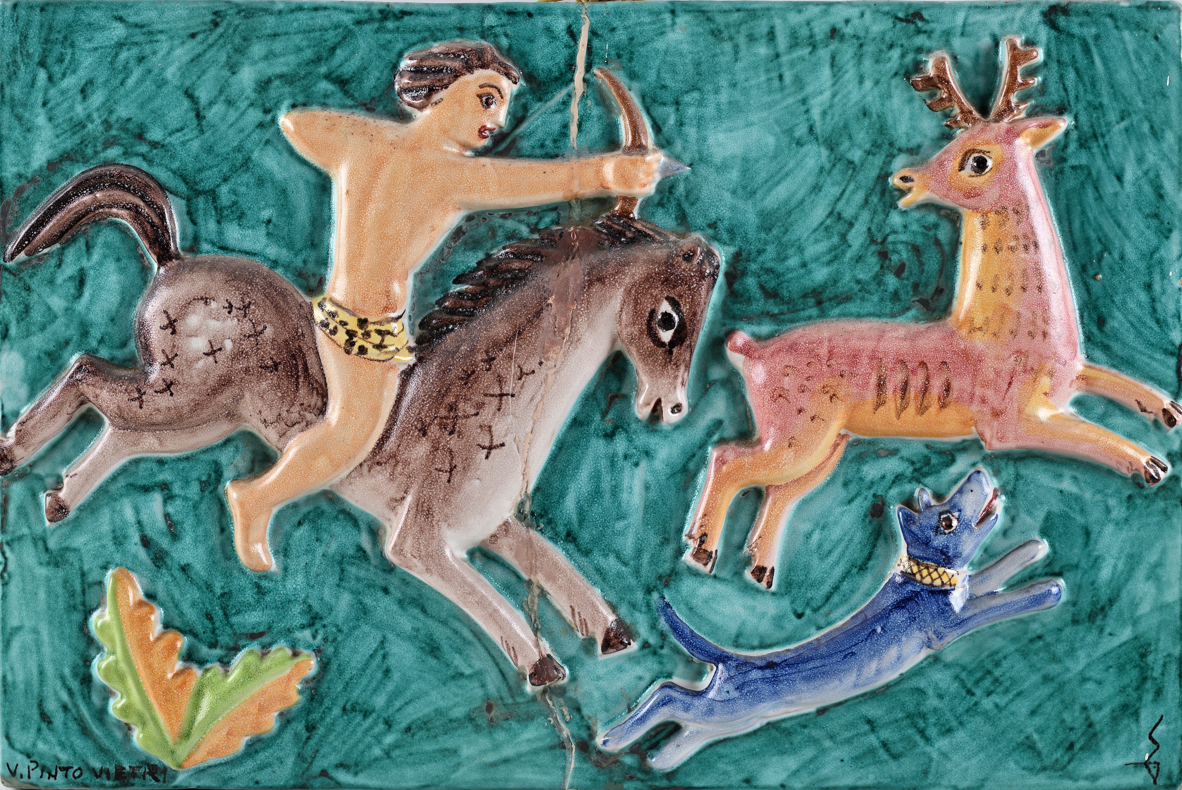 Il bassorilievo ritrae una scena di caccia con l'arco di un uomo a cavallo, in basso a sinistra reca firma "V. Pinto, Vietri" ed in basso a destra monogramma Giovannino Carrano. Difetti.