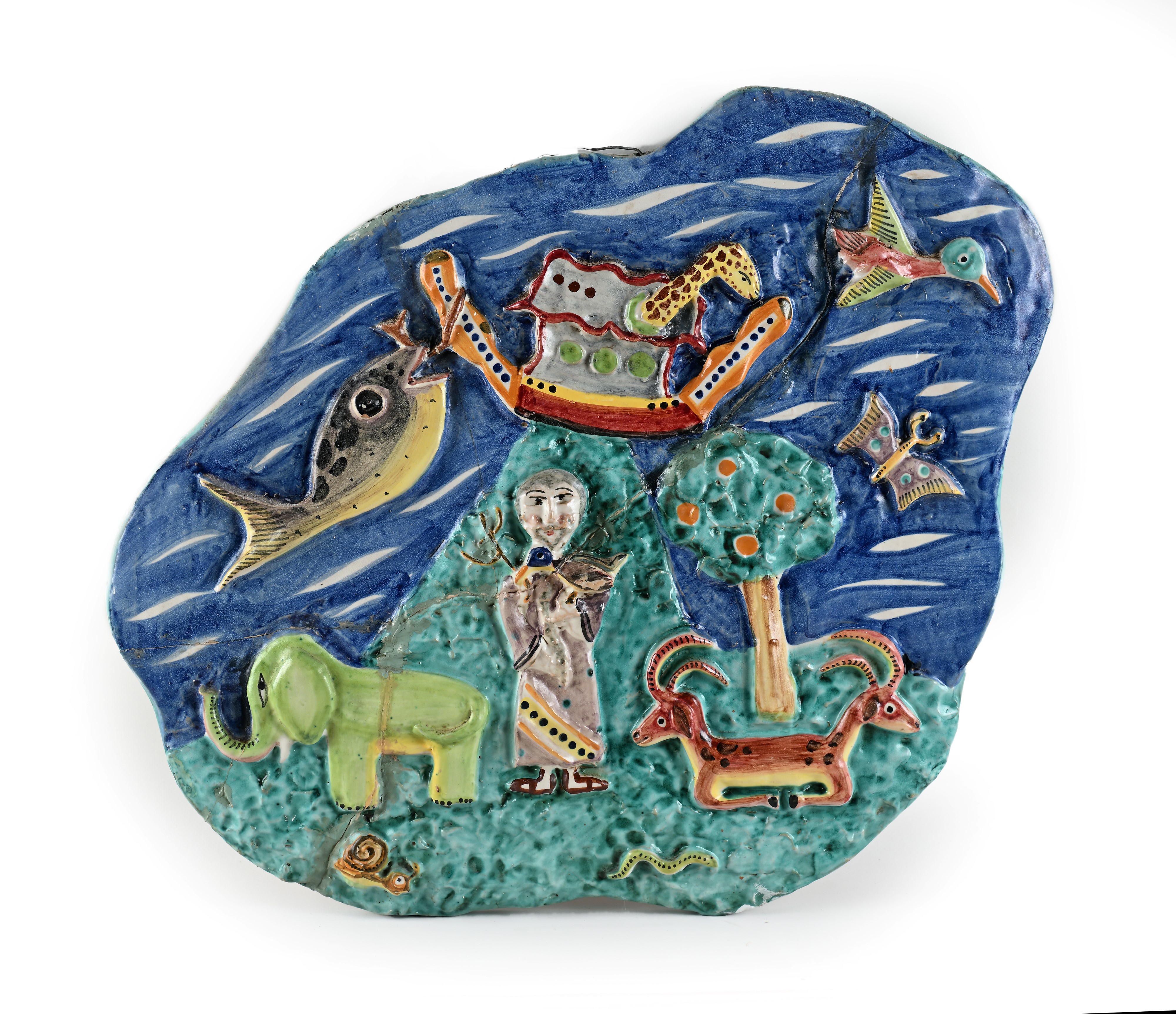 Il maestro Pinto ha mirabilmente rappresentato il racconto biblico dell'Arca di Noè. Troviamo quindi Noè al centro della composizione e sopra di lui l'Arca con una giraffa dentro. Intorno una moltitudine di animali tra cui uccelli, farfalle, elefanti, serpenti, pesci, lumache e antilopi. Al verso reca firma "V. Pinto, Vietri, Italia". Difetti