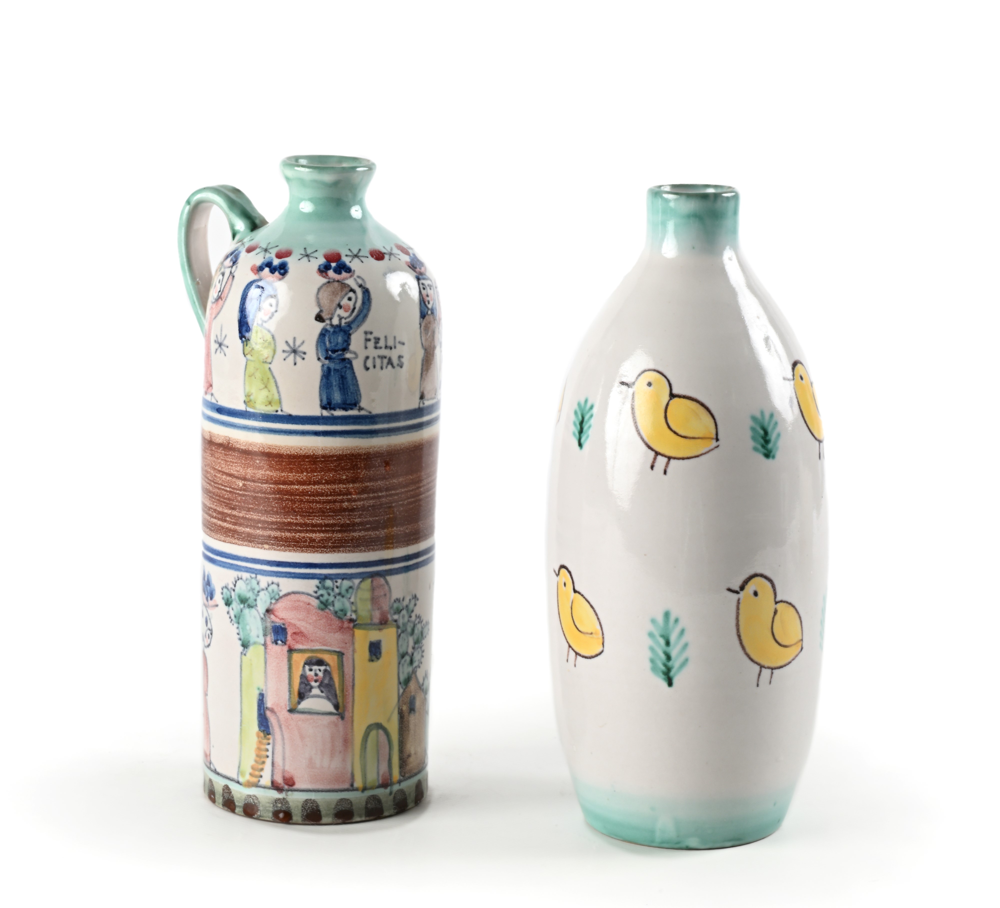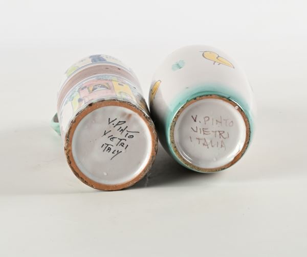 Lotto di un vaso ed una brocca in ceramica dipinte, manifattura Pinto, Vietri sul mare