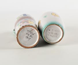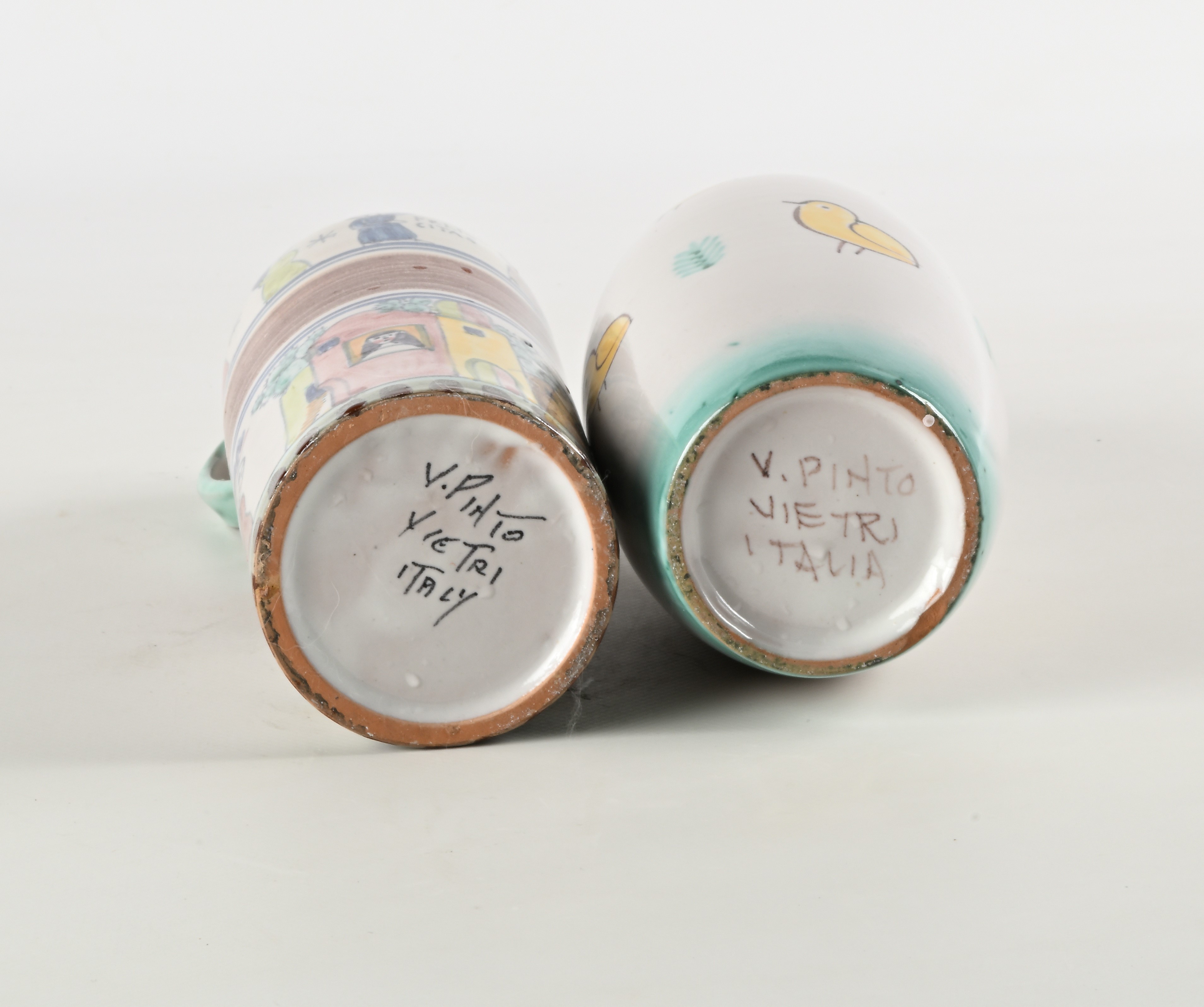 Il vaso misura cm h 25 ed è decorato con piccoli pulcini gialli e foglie su fondo bianco ed è firmato sotto la base "V. Pinto Vietri Italia". La brocca misura cm h 27 ed è decorata con scene di pesca e veduta di paesino nella parte sotto, la fascia superiore rappresenta scene di raccolta della frutta. Sotto la base è firmato "V. Pinto, Vietri Itali".