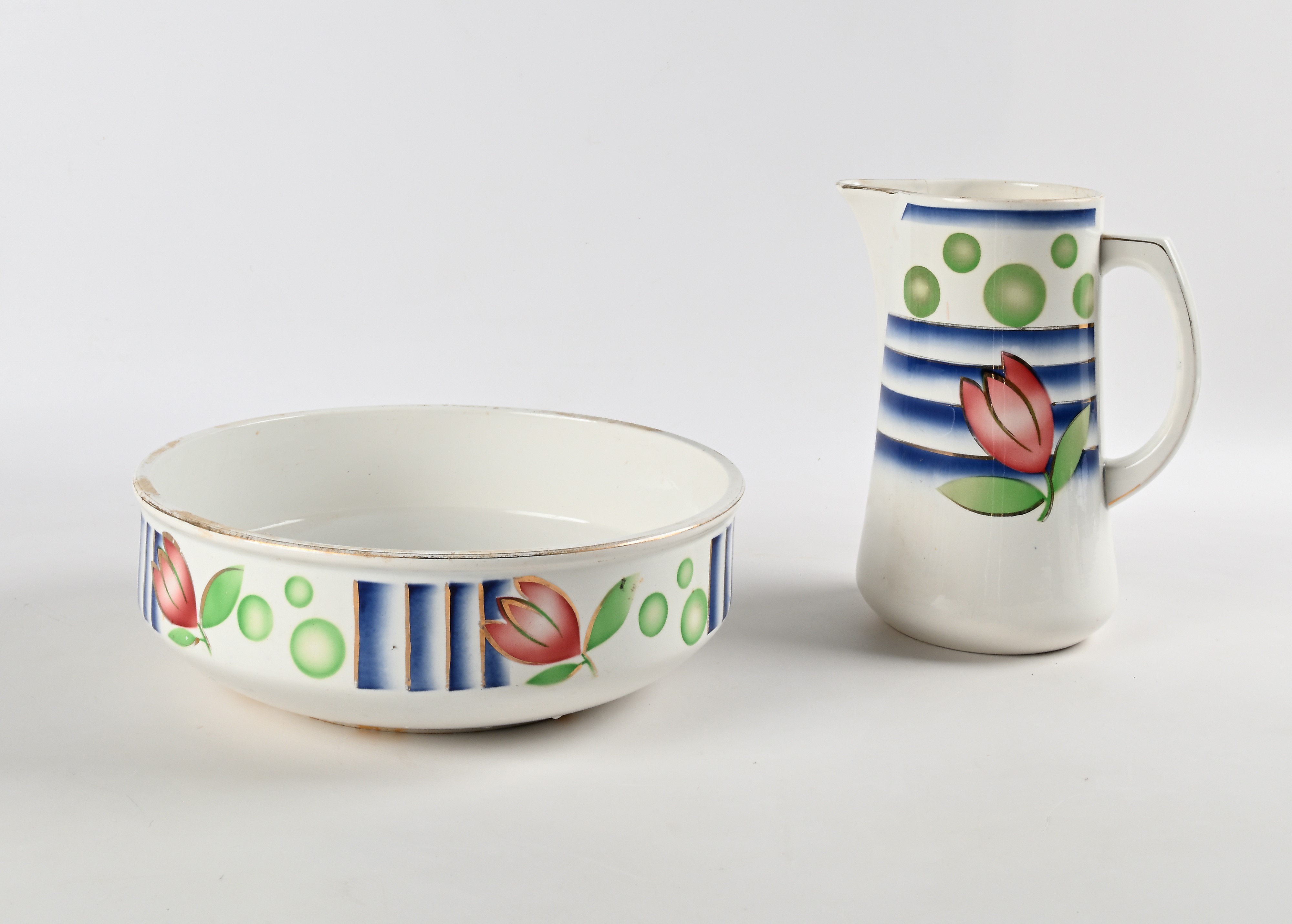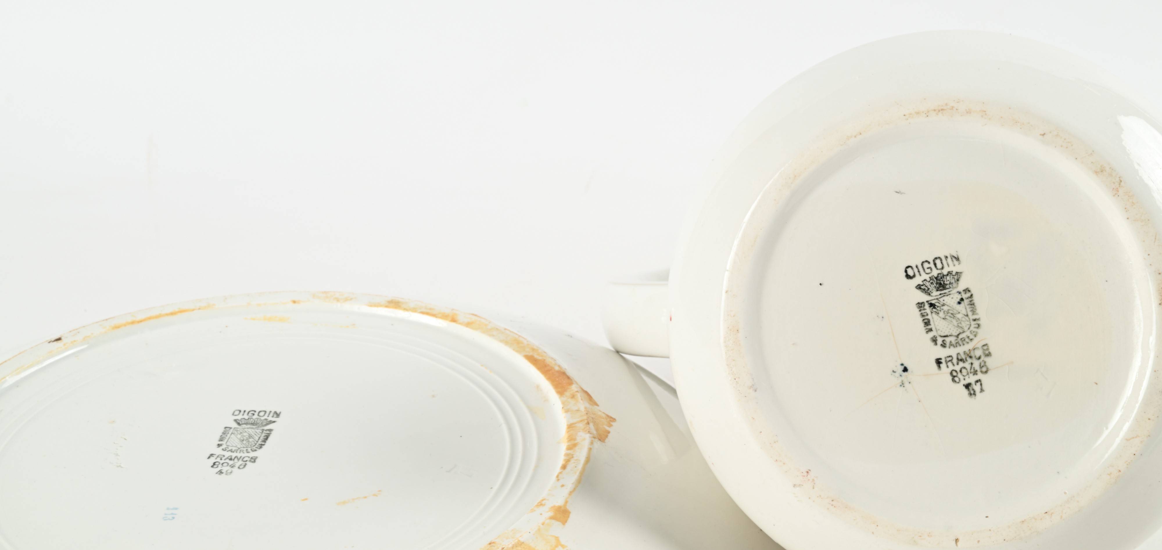 Il versatoio misura cm h 28, il recipiente cm 34 Ø. Sotto la base sono entrambe marchiate "Digoin France"