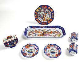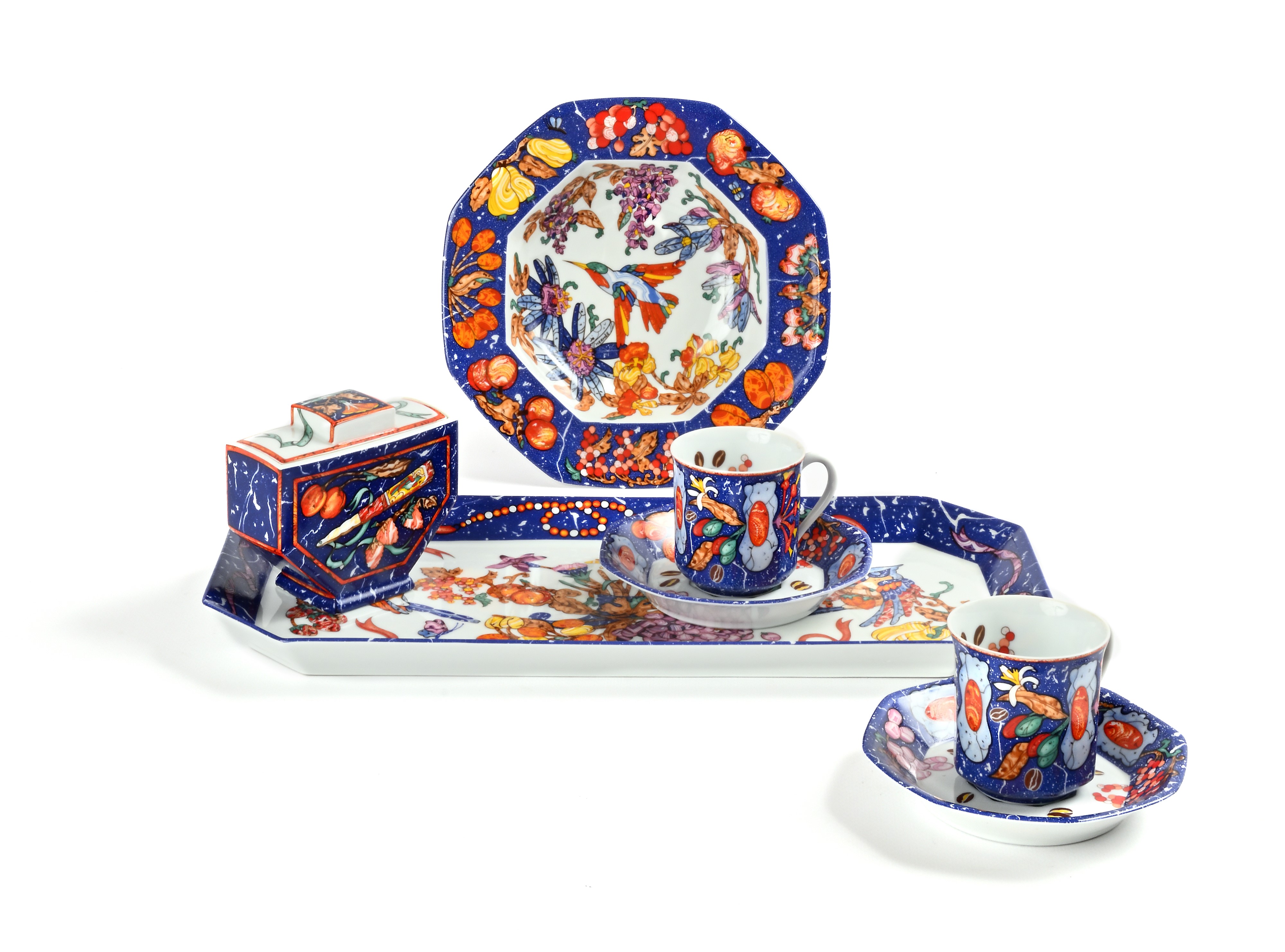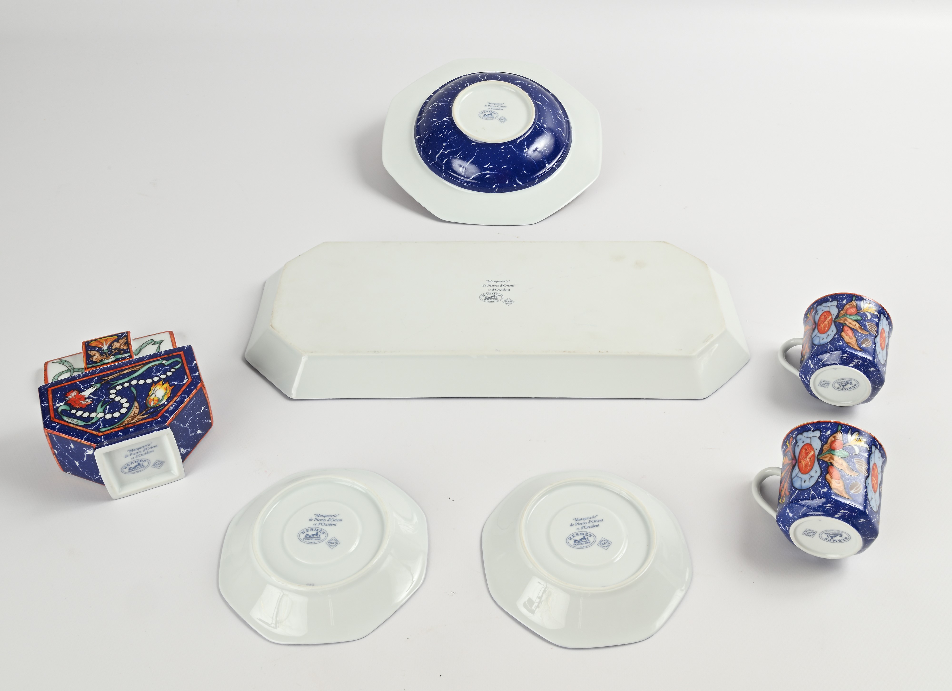 Servizio completo di vassoio, due tazzine con piattini, zuccheriera e piatto fondo in porcellana dipinta nei motivi floreali ed animali. Sotto la base marchi "Hermes Porcelain Paris" e "marqueterie de Pierres d'Orient et d'Occident"