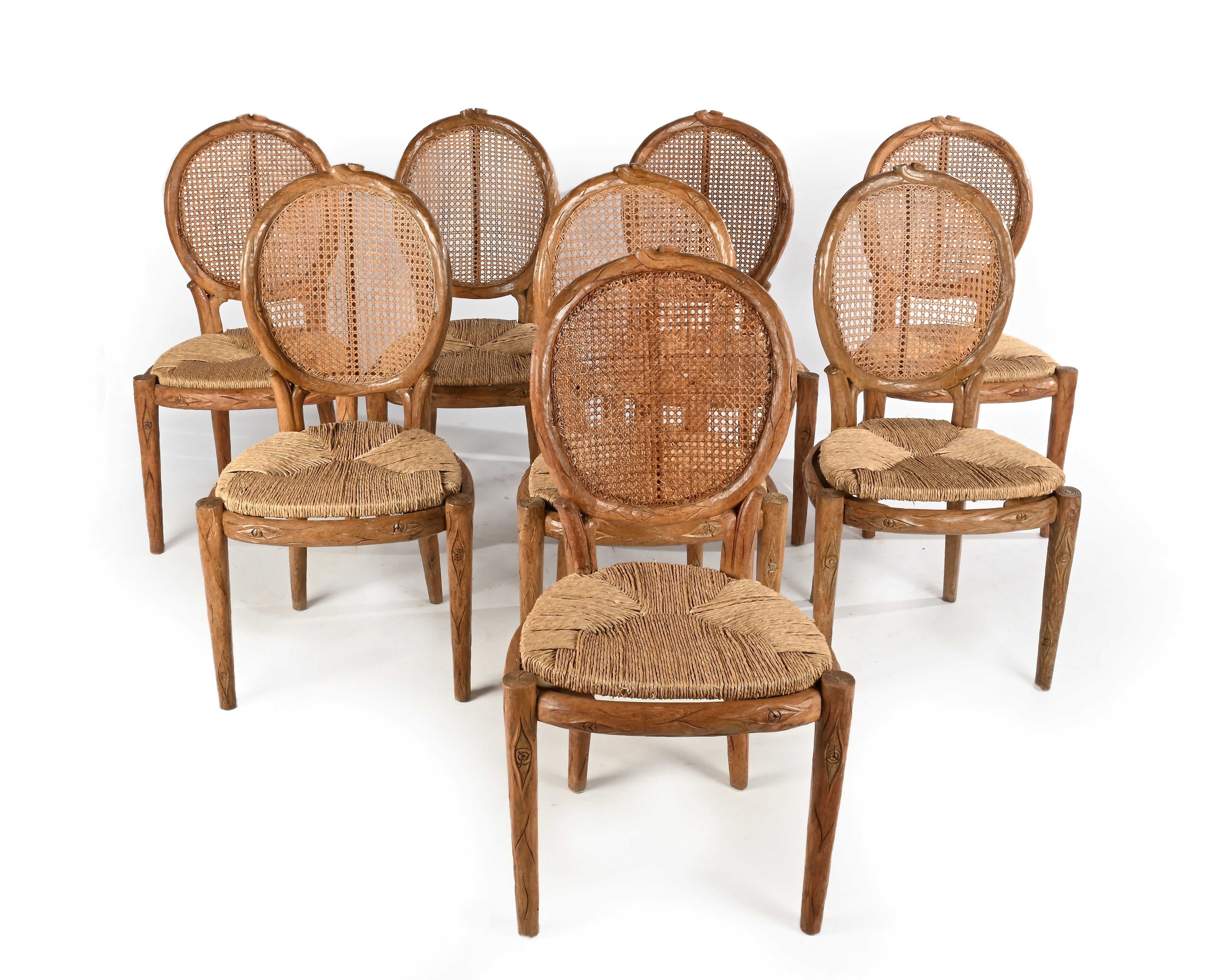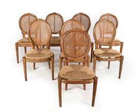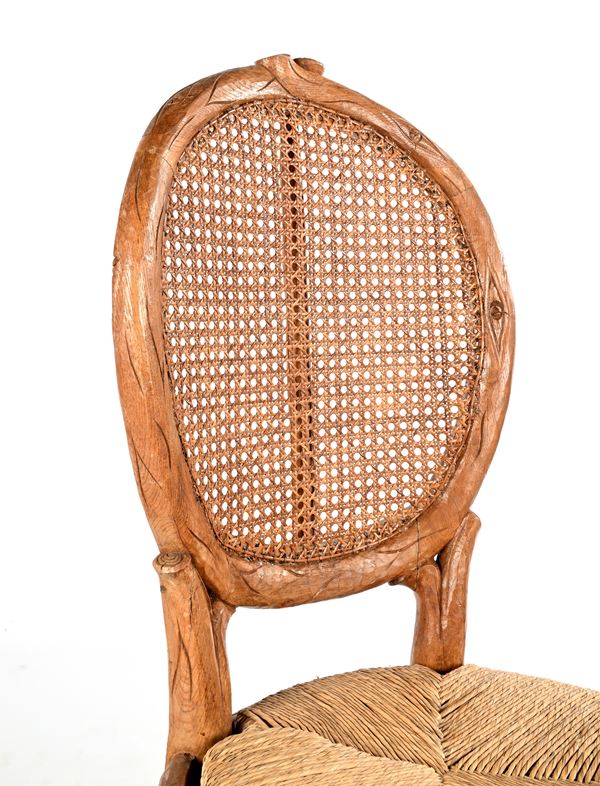 Realizzate in legno intagliato a motivi decorativi vegetali, schienale in paglia di vienna.