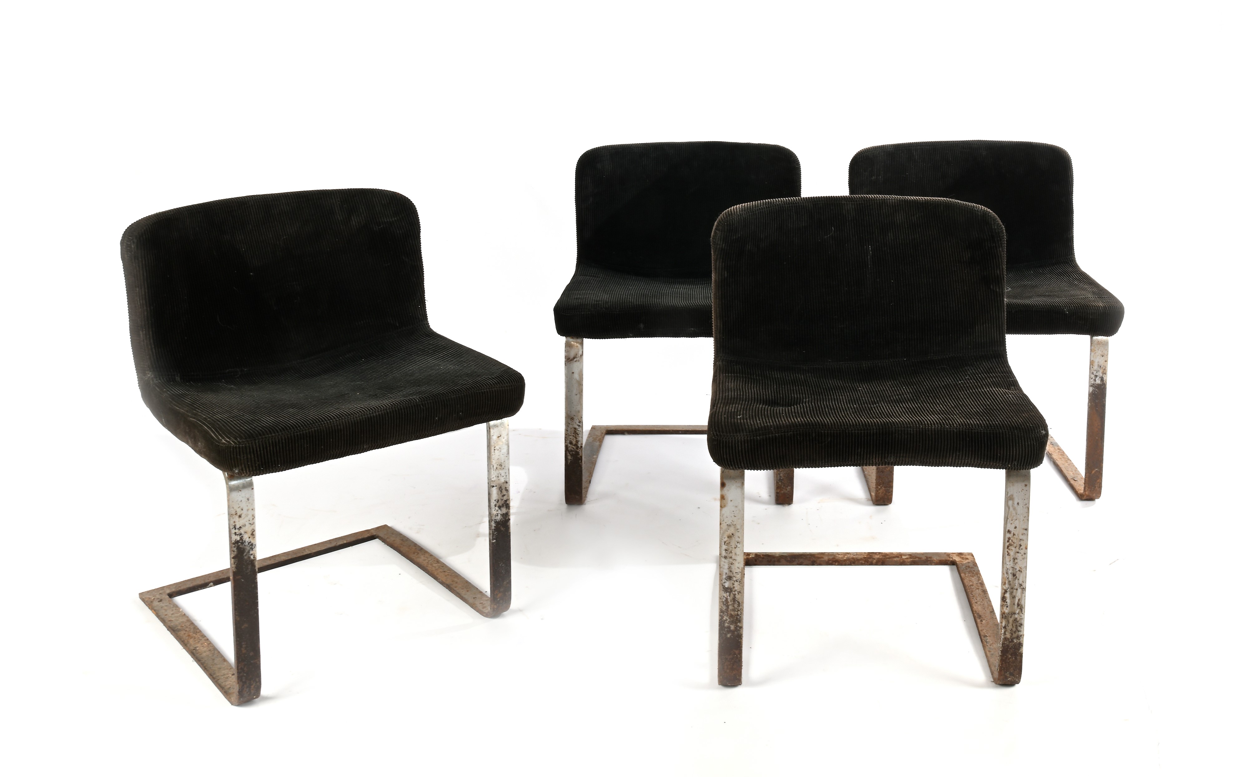 Quattro poltrone, struttura in metallo cromato e rivestimento in tessuto marrone, Italia