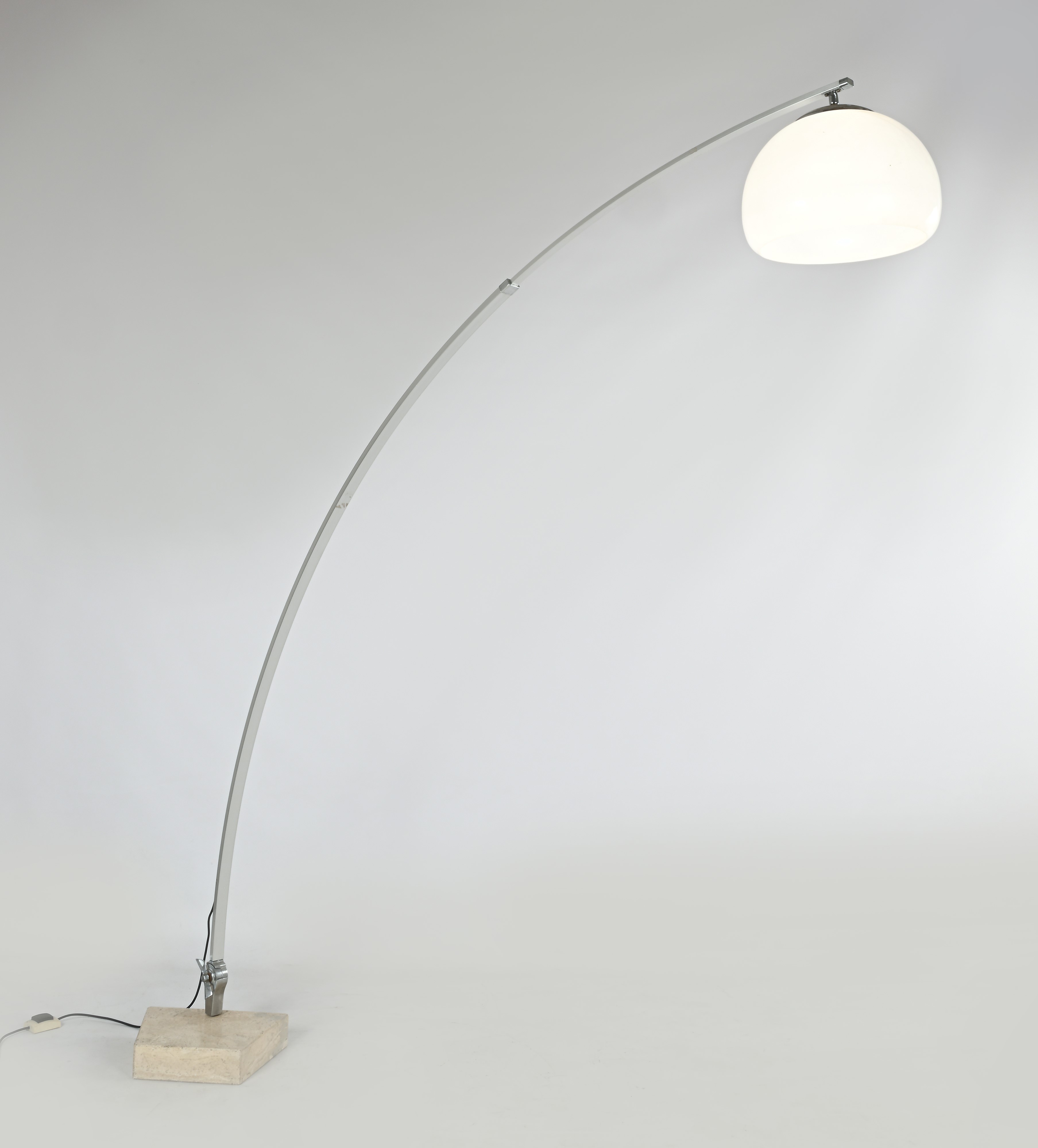 Struttura in metallo cromato, base in marmo e paralume in plastica bianca