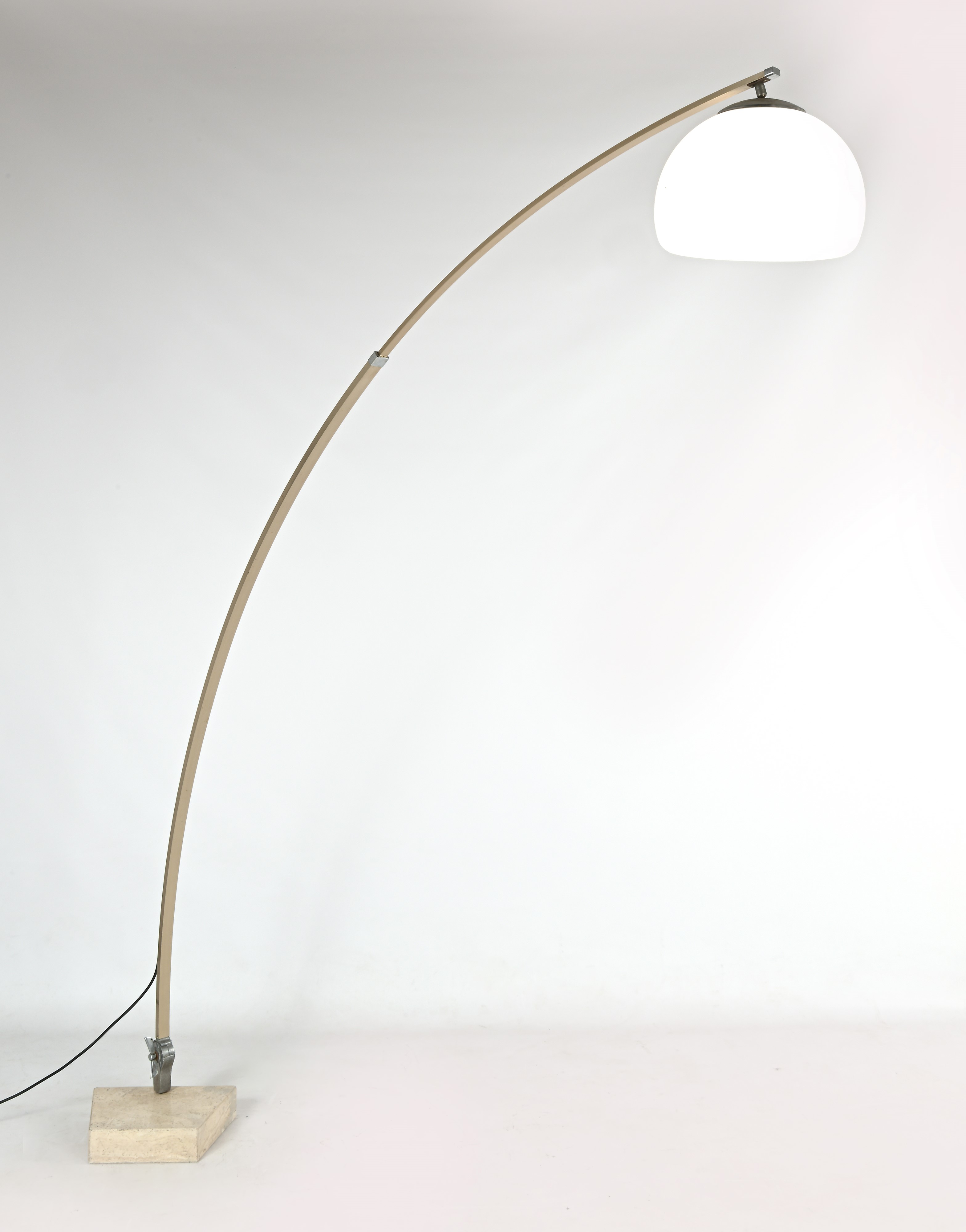 Struttura in metallo dorato, base in marmo e paralume in plastica bianca
