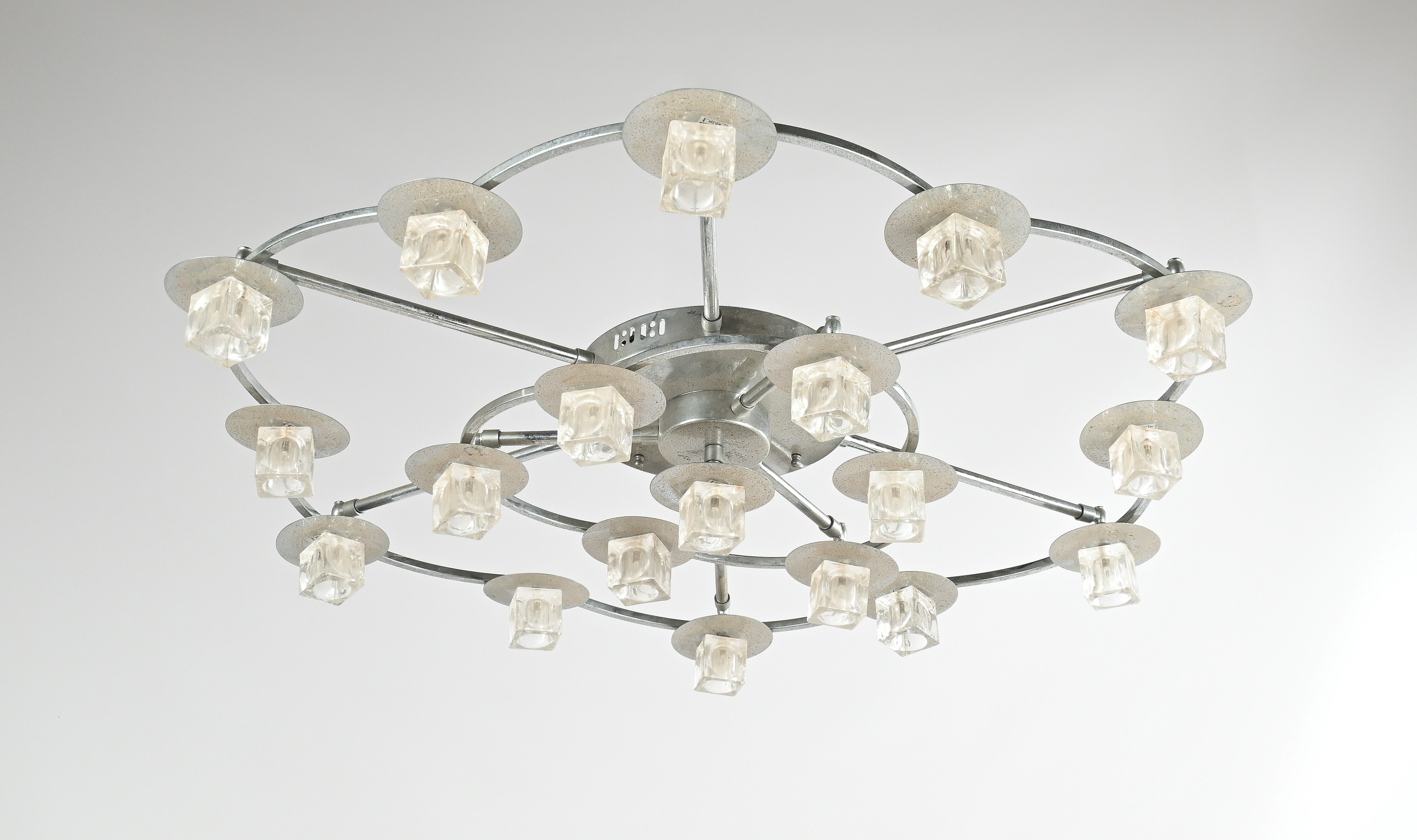 Struttura in metallo cromato e diffusori in vetro a forma di cubo