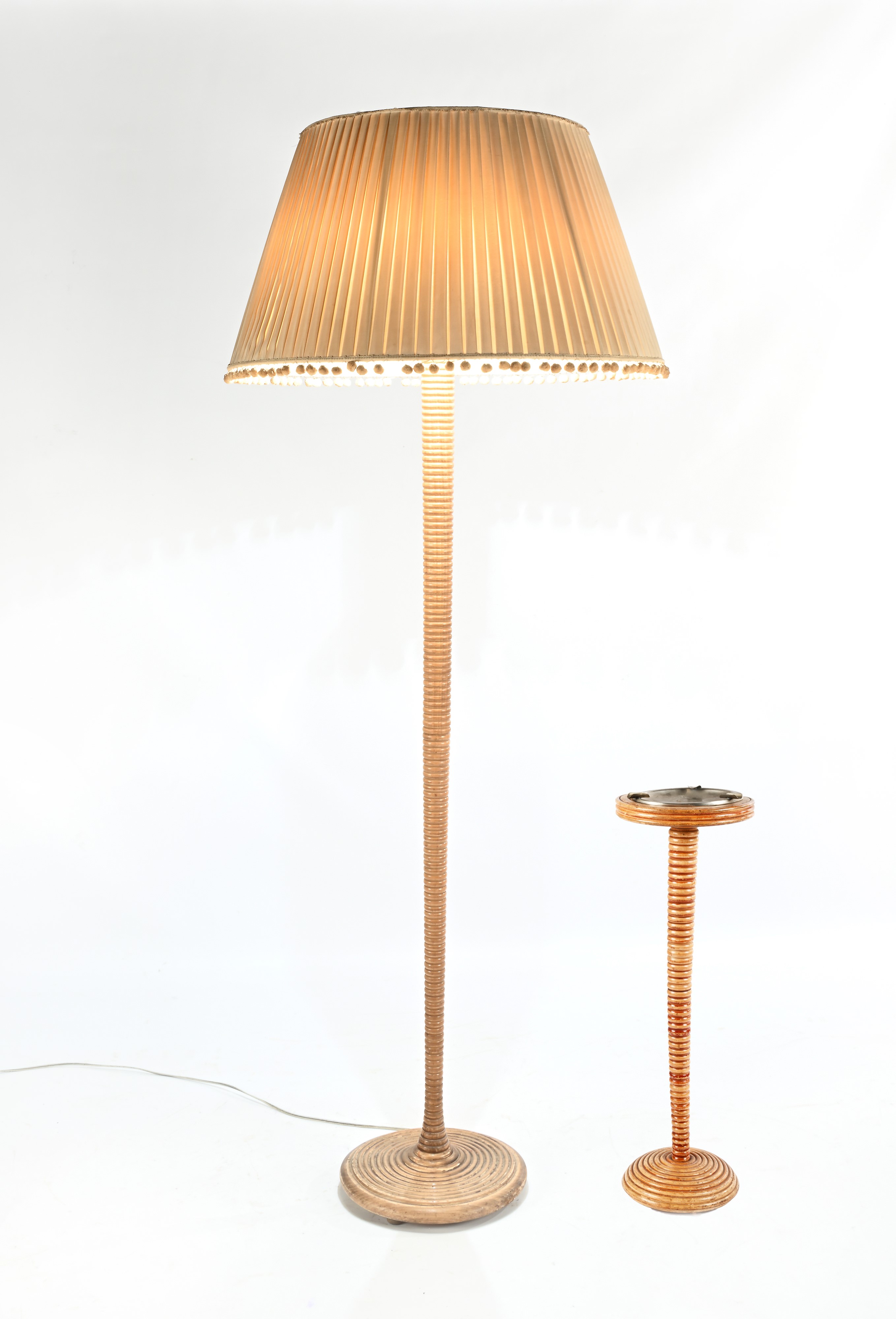La lampada misura cm 185x35 escluso il paralume in tessuto plissettato. Il posacenere misura cm 63x20. Entrambi sono realizzati in legno e metallo cromato. La lampada ha la montatura in ottone. Etichetta del produttore "Sciolari".