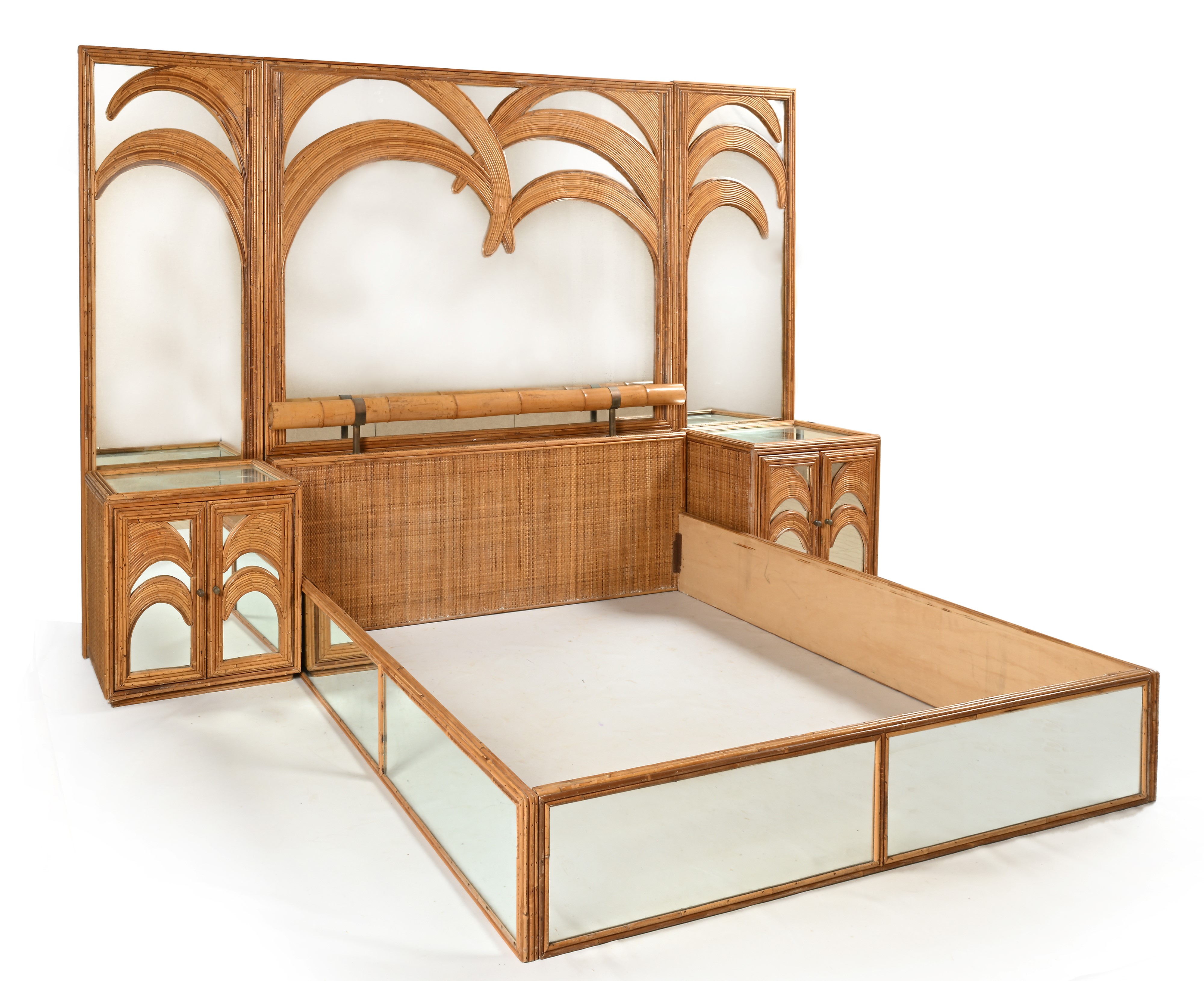 Camera da letto completa di base del letto, specchiera e due comodini (i due comodini misurano cm h 60x60x50). Tutti i complementi di arredo sono stati realizzati nei tipici motivi decorativi e con i materiali che hanno caratterizzato la fortuna della casa produttrice. La specchiera è decorata con le tipiche palme di Vivai del Sud, la struttura compresa dei comodini è realizzata in rattan e giunco, la testiera in bambù.