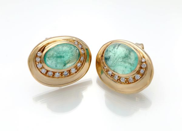 Coppia di orecchini in oro, smeraldi e brillanti