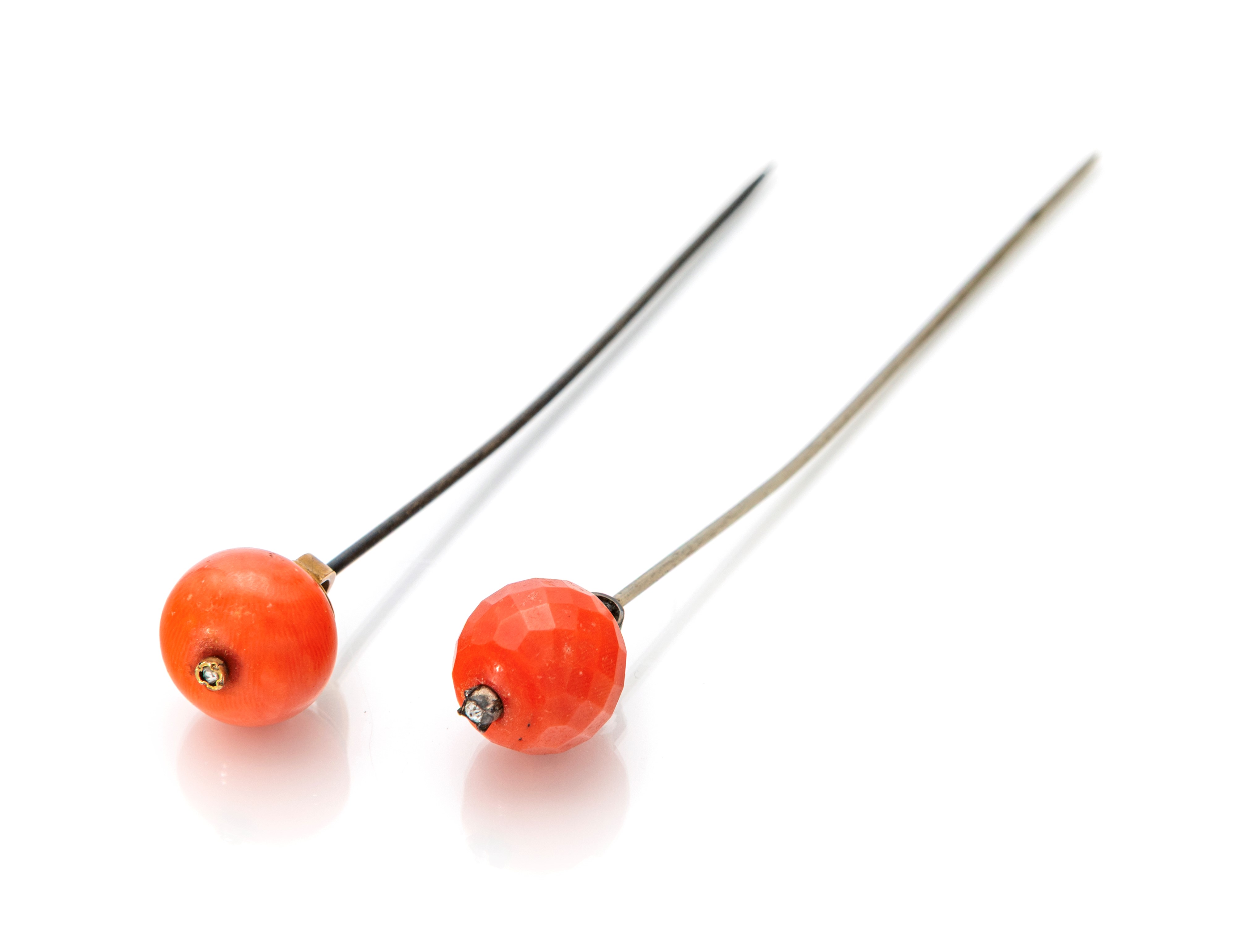Coppia di spilloni in oro, argento e corallo