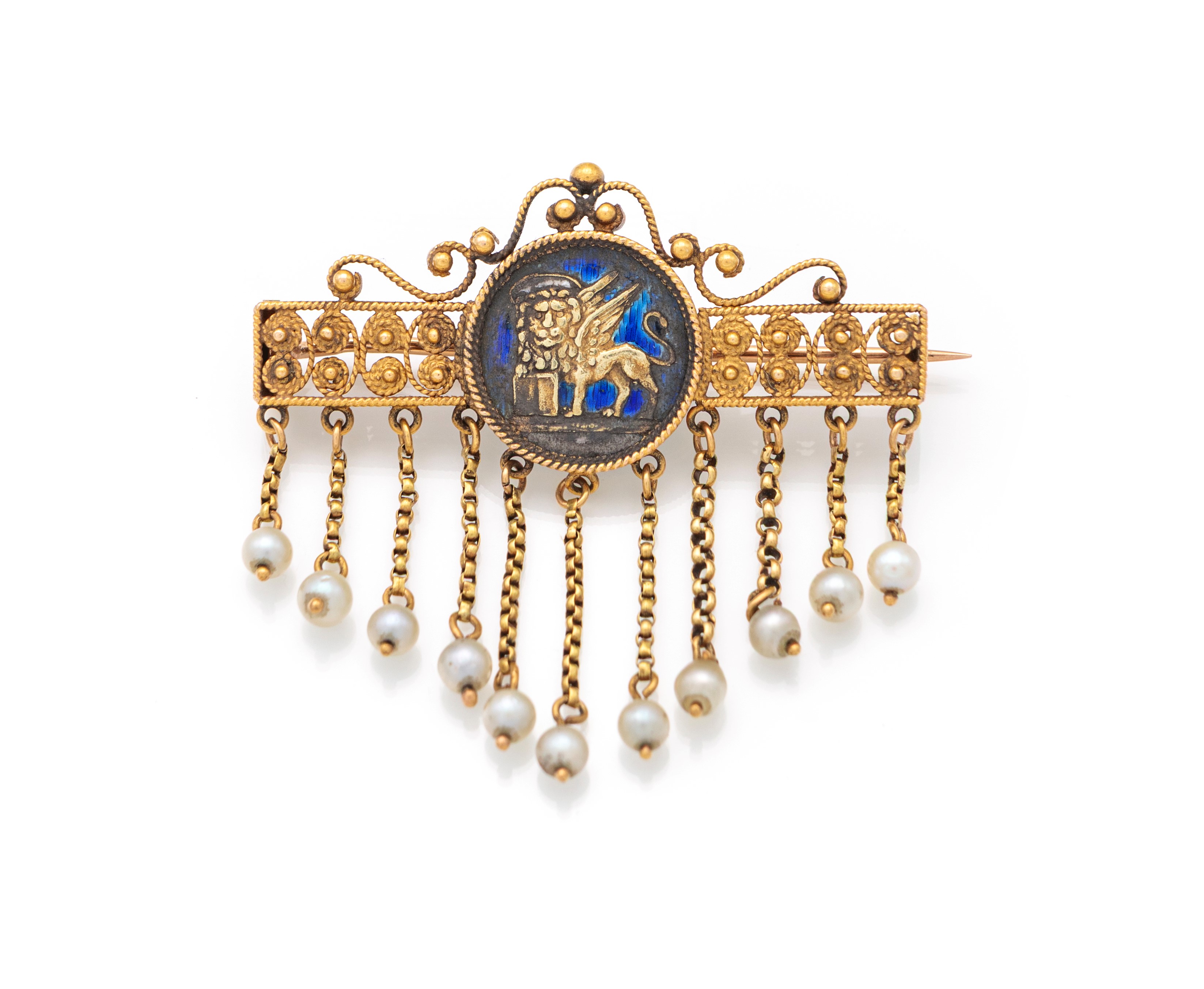 Oro giallo 750/000. Fregio centrale del Leone di Venezia in oro e smalto. Peso complessivo gr. 6. Lievi difetti