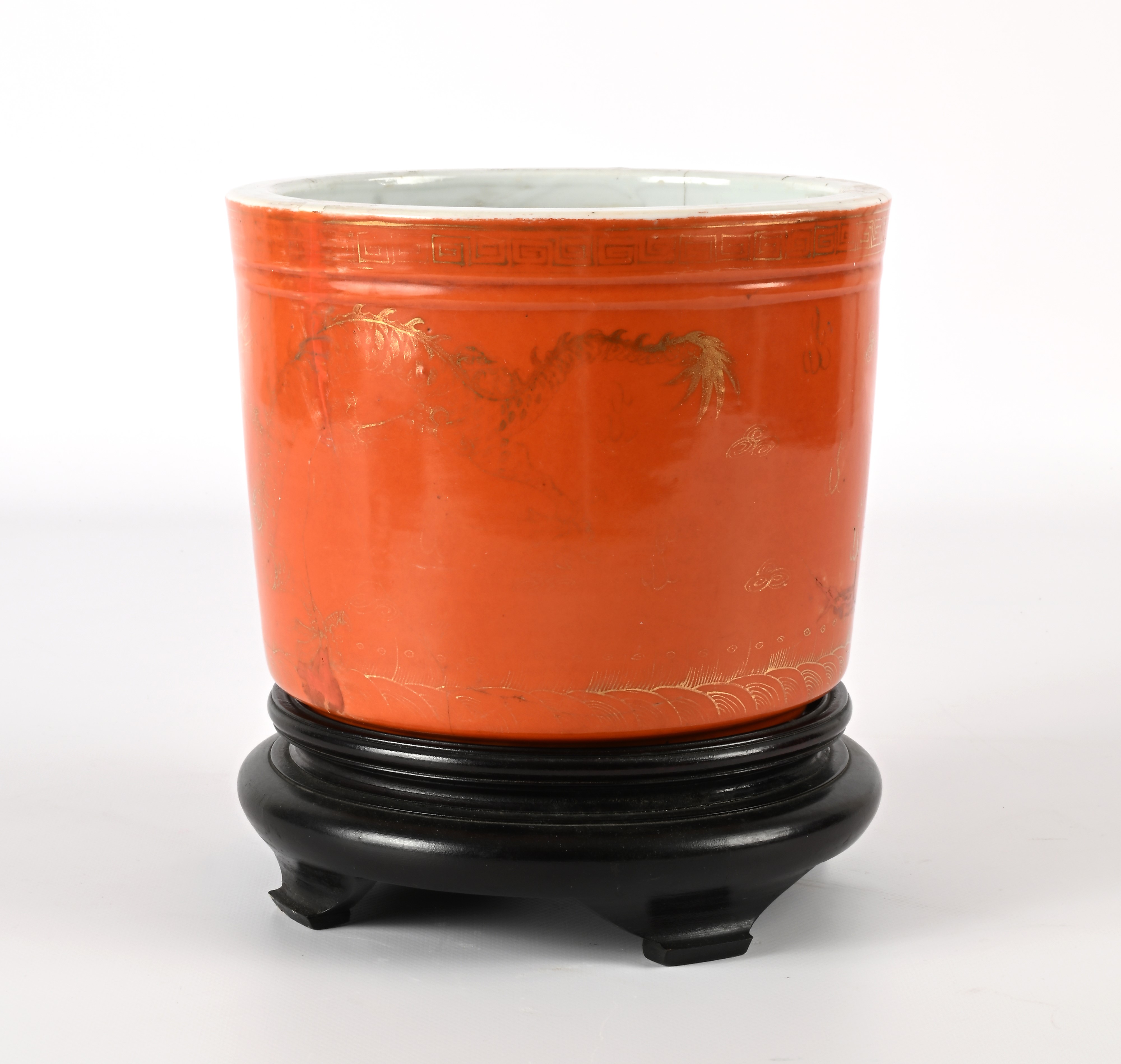 Cache-pot in porcellana rosso ferro con lumeggiature dorate, Cina, XVIII secolo