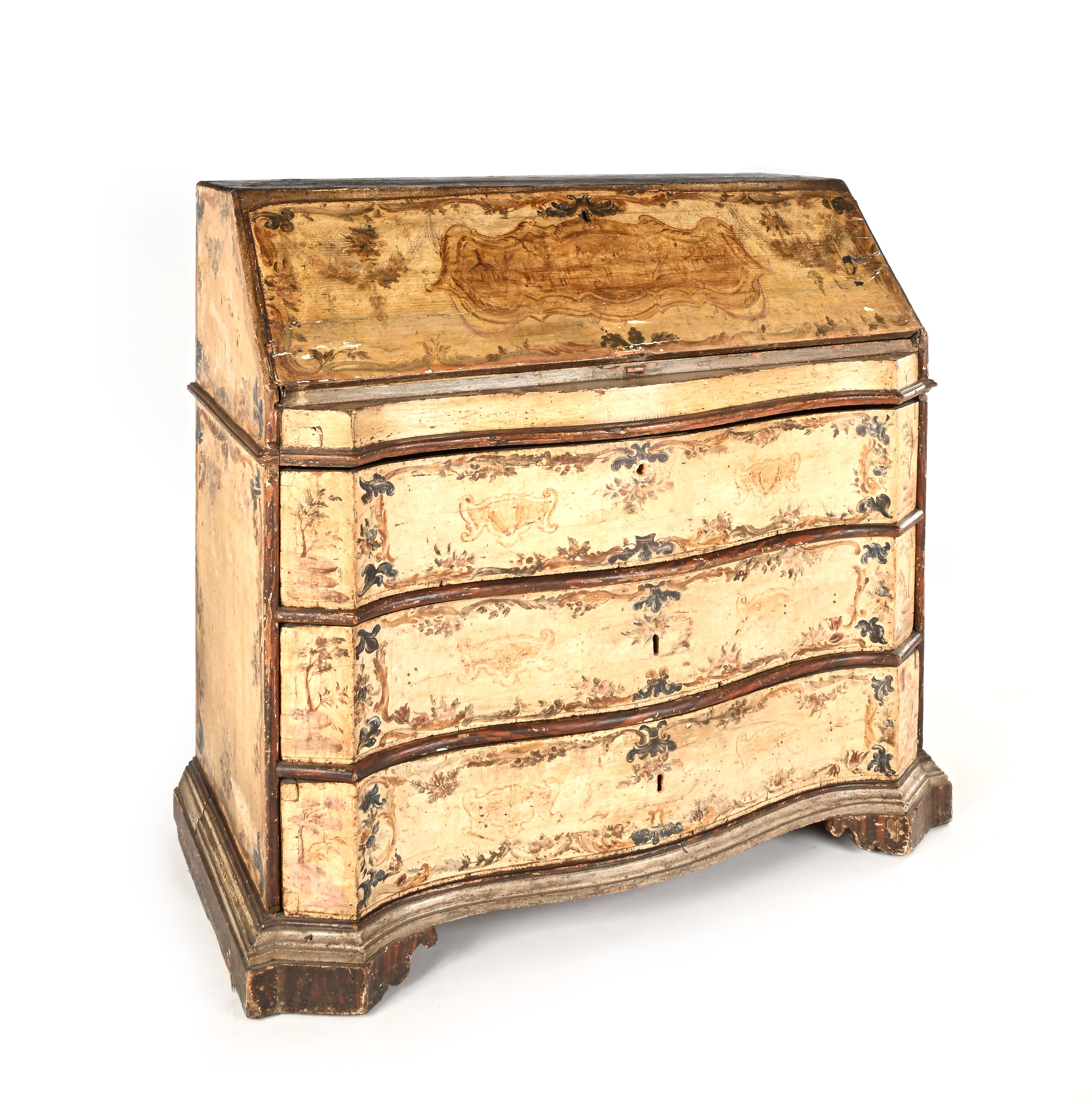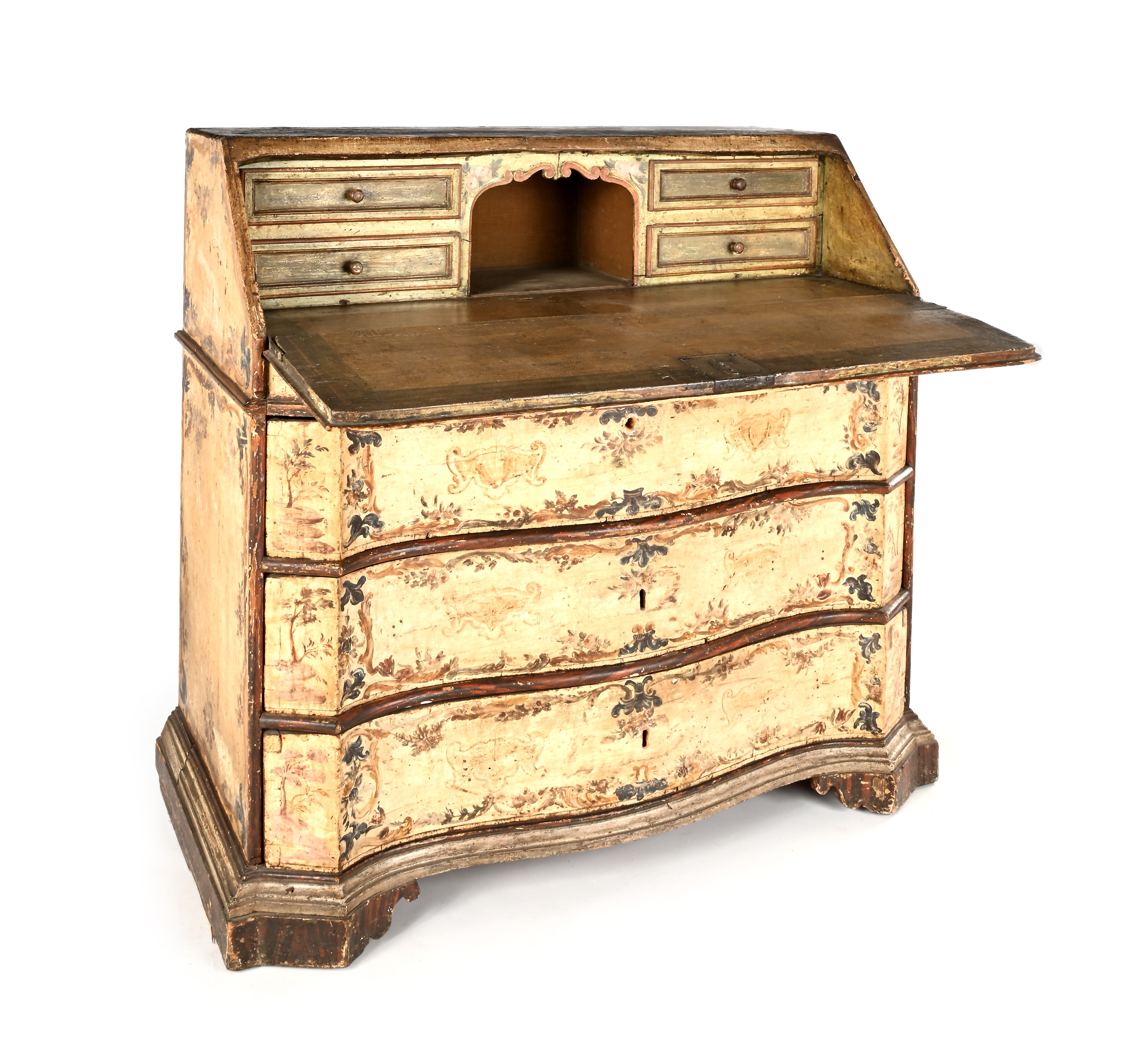 Cassettone a ribalta in legno laccato e dipinto, Veneto, XVIII secolo