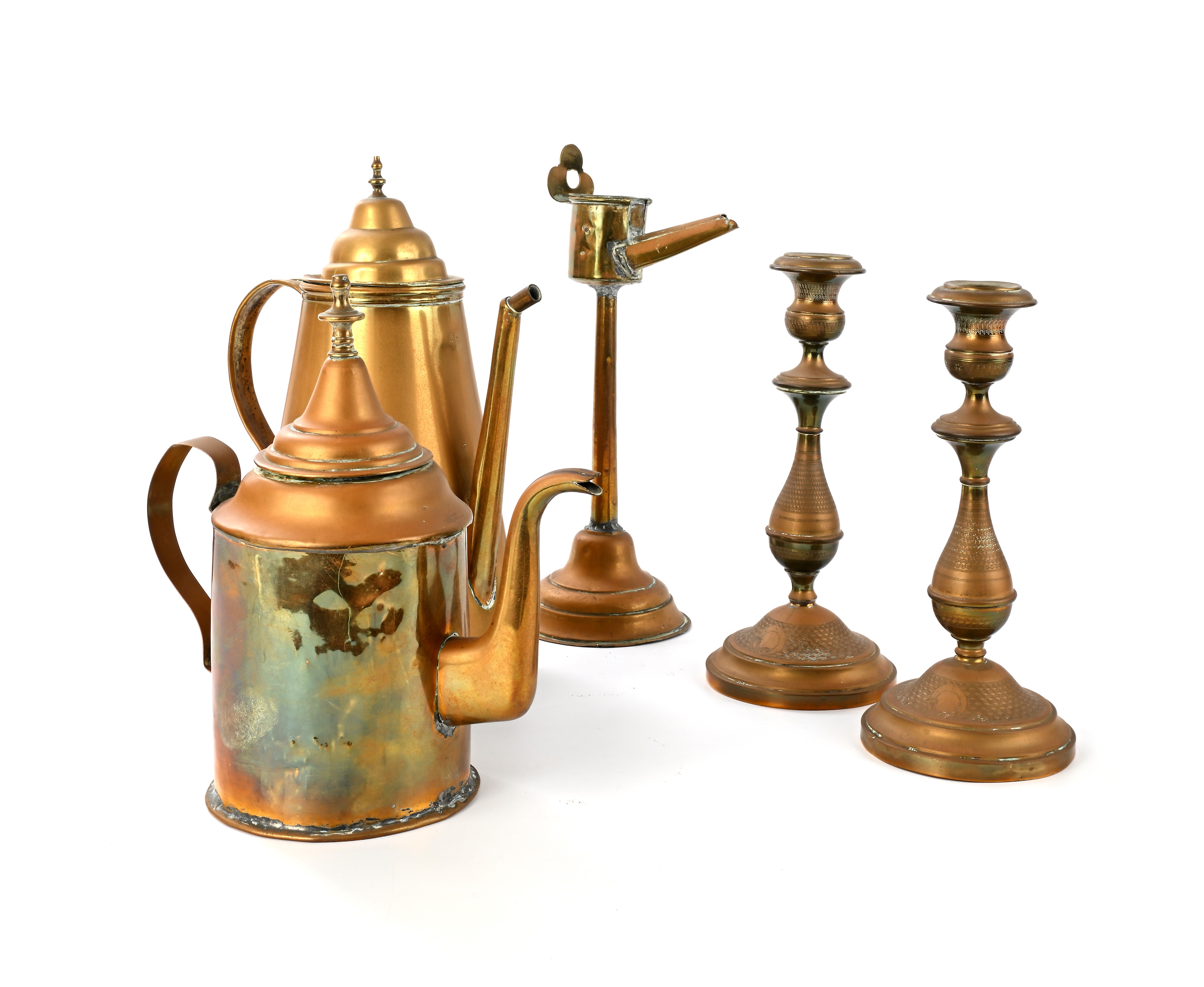 caffettiera di forma troncoconica con versatoio cilindrico e coperchio a cupolino (altezza cm 30); caffettiera cilindrica con versatoio e manico sagomati (altezza cm 24); lucerna con alto stelo cilindrico su piede circolare (altezza cm 30); coppia di candelieri (altezza cm 23,5)