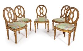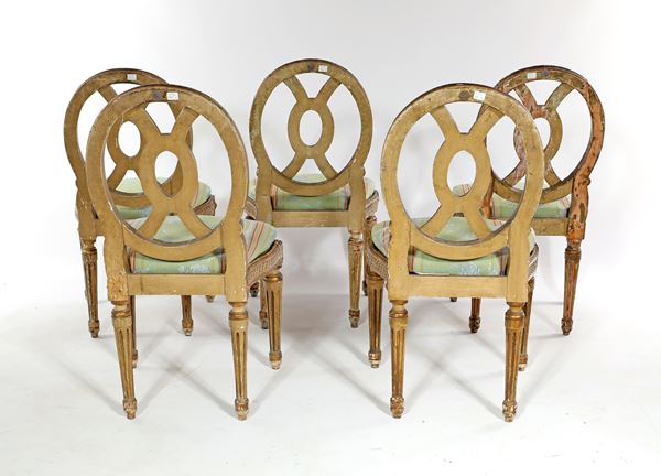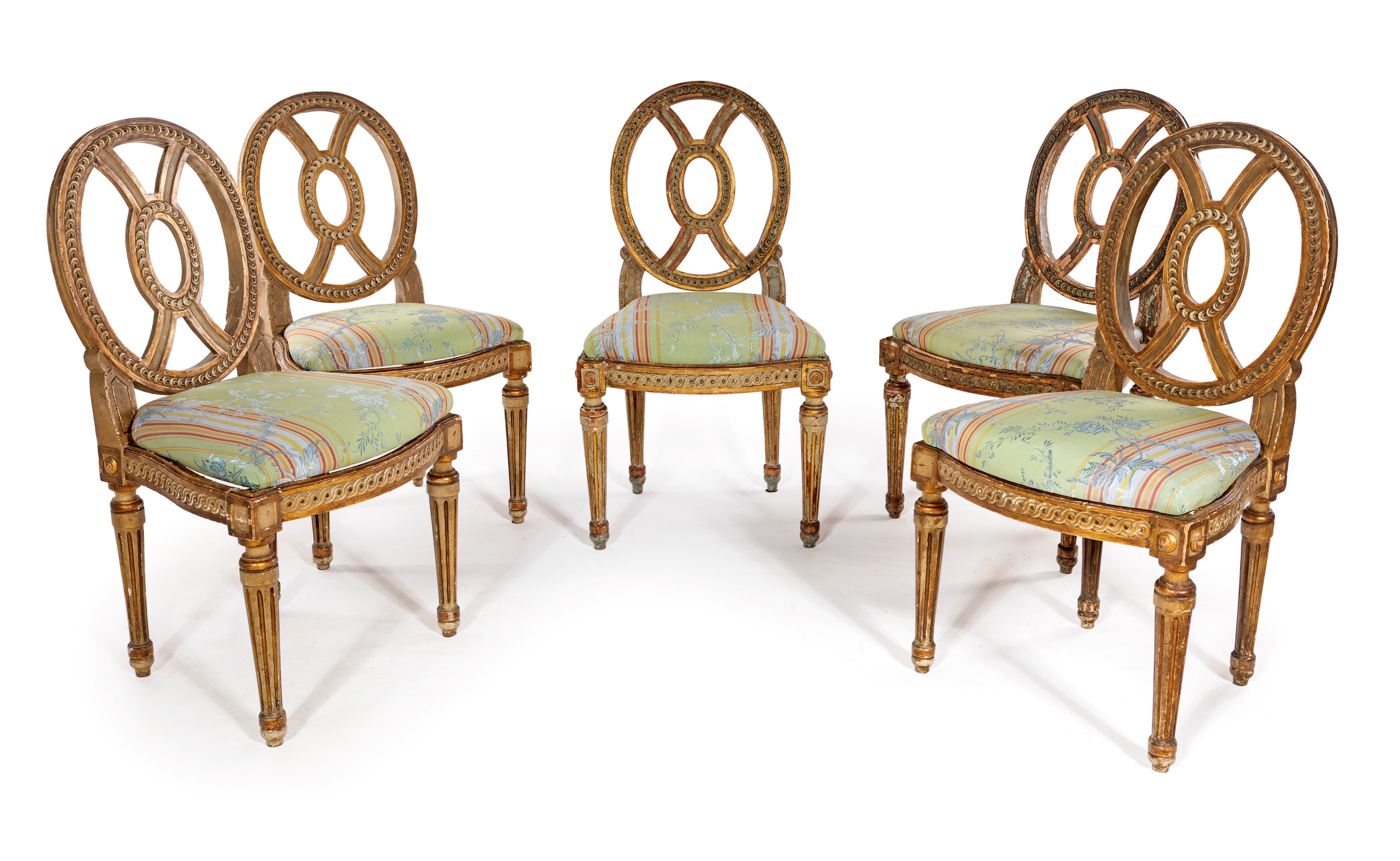 Cinque sedie in legno laccato, schienali a giorno ovali - difetti